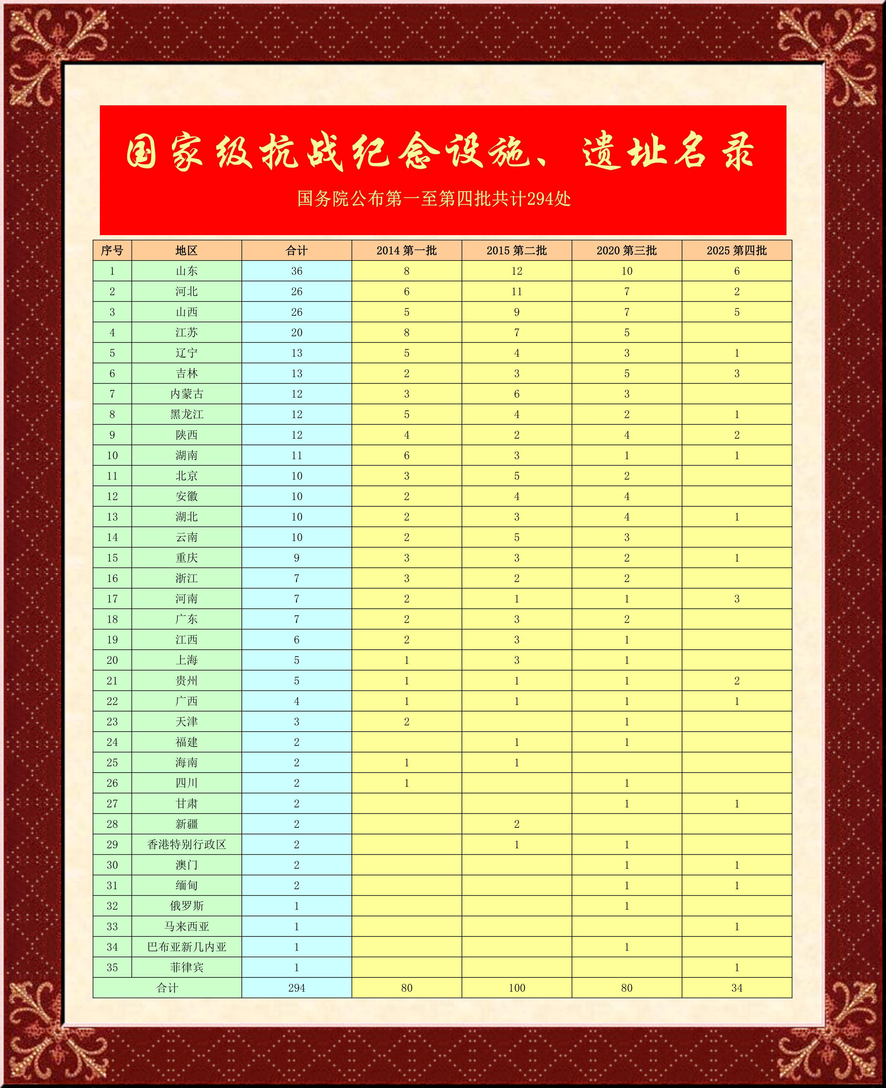 国务院公布国家级抗战纪念设施、遗址名录 第一至第四批共计294处