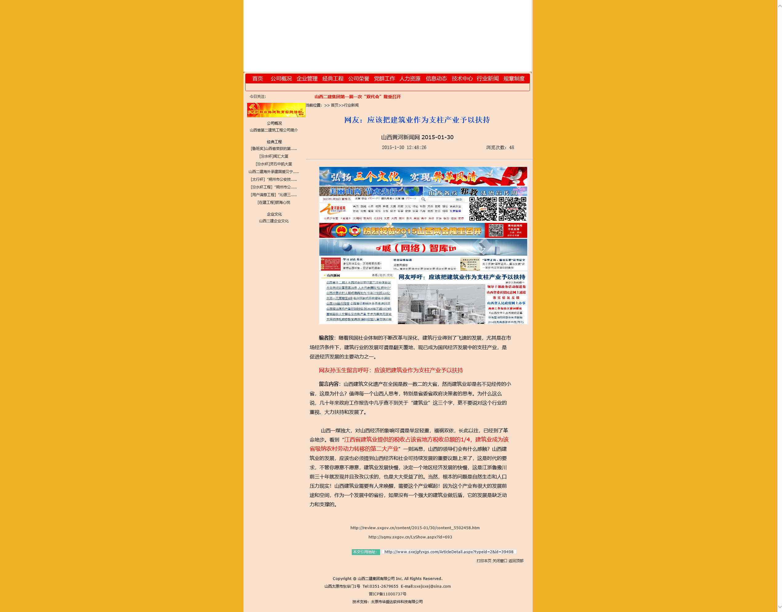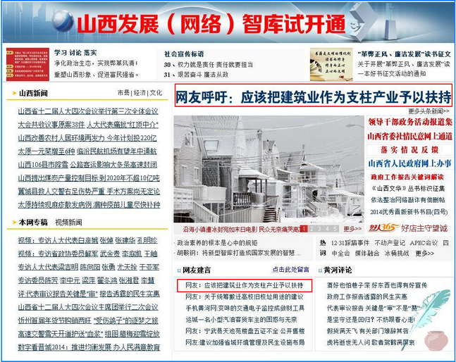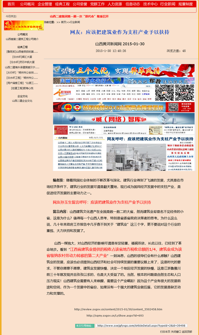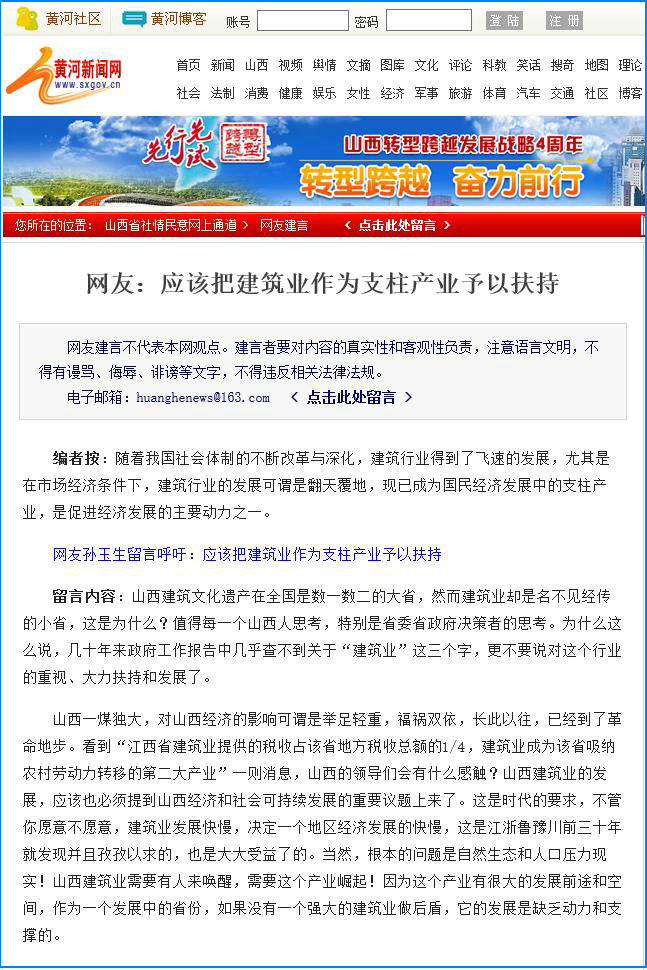 留言内容:山西建筑文化遗产在全国是数一数二的大省,然而建筑业却是名不见经传的小省,这是为什么?值得每一个山西人思考,特别是省委省政府决策者的思考。为什么这么说,几十年来政府工作报告中几乎查不到关于“建筑业”这三个字,更不要说对这个行业的重视、支持、大力扶持和发展了。山西一煤独大,对山西经济的影响可谓是举足轻重,福祸双依,长此以往,已经到了革命地步。看到“江西省建筑业提供的税收占该省地方税收总额的1/4,建筑业成为该省吸纳农村劳动力转移的第二大产业”一则消息,山西的领导们会有什么感触?山西建筑业的发展,应该也必须提到山西经济和社会可持续发展的重要议题上来了,这是时代的要求,不管你愿意不愿意,建筑业发展快慢,决定一个地区经济发展的快慢,这是江浙鲁豫川前三十年就发现并且孜孜以求的,也是大大受益了的。当然,根本的问题是自然生态和人口压力逼迫的!山西建筑业需要有人来唤醒,需要这个产业崛起!因为这个产业有很大的发展前途和空间,作为一个发展中的省份,如果没有一个强大的建筑业做后盾,她的发展是缺乏动力和支撑的。
