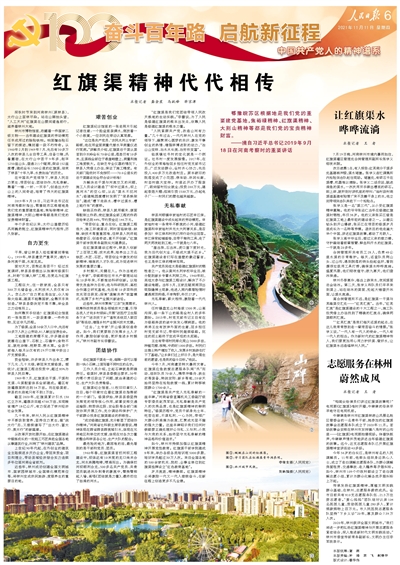 红旗渠的修建离不开党的领导和人民群众的艰苦奋斗。时任河南林县(今林州市)县委第一书记的杨贵作为红旗渠总设计师,勇于担当,克服重重阻力,历时10年,终于建成被誉为“人工天河”的红旗渠水利工程。