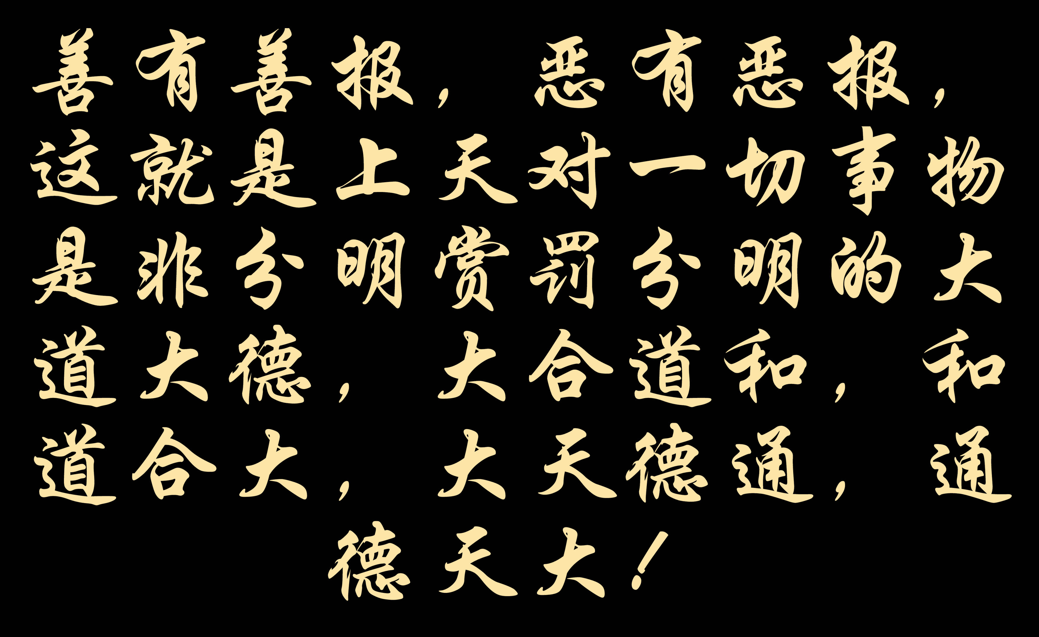 善有善报,恶有恶报,这就是上天对一切事物是非分明赏罚分明的大道大德:大合道和,和道合大,大天德通,通德天大!