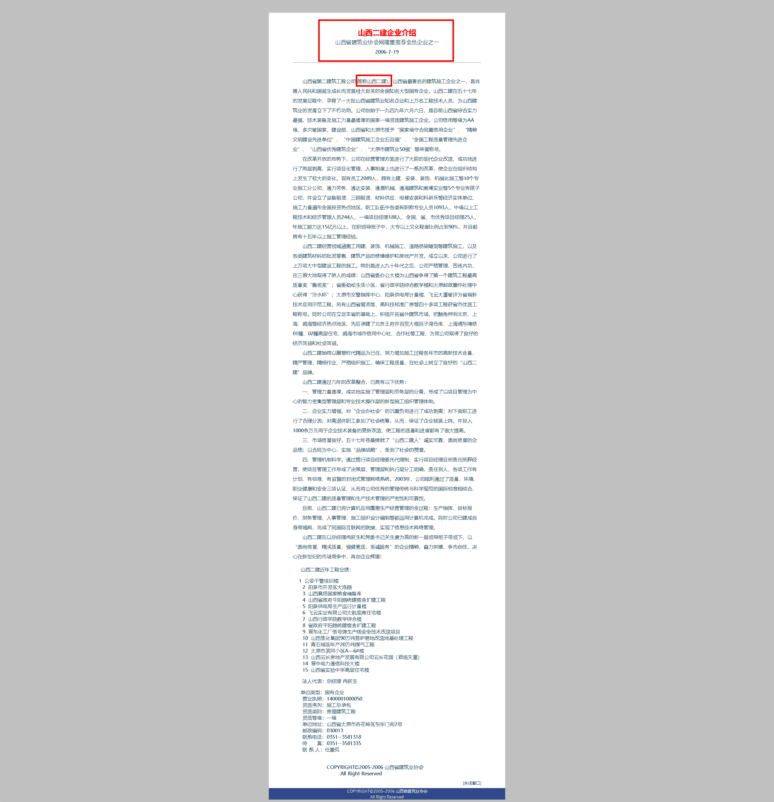 你看看我是如何推荐我的母企的,是协会作为宣传会员企业的第一家,尤其是我划了红框的“山西二建”,更是历史上第一次这么称呼,十年后2016年1月5日的山西二建集团有限公司揭牌仪式,正是那时候就开始谋划的!