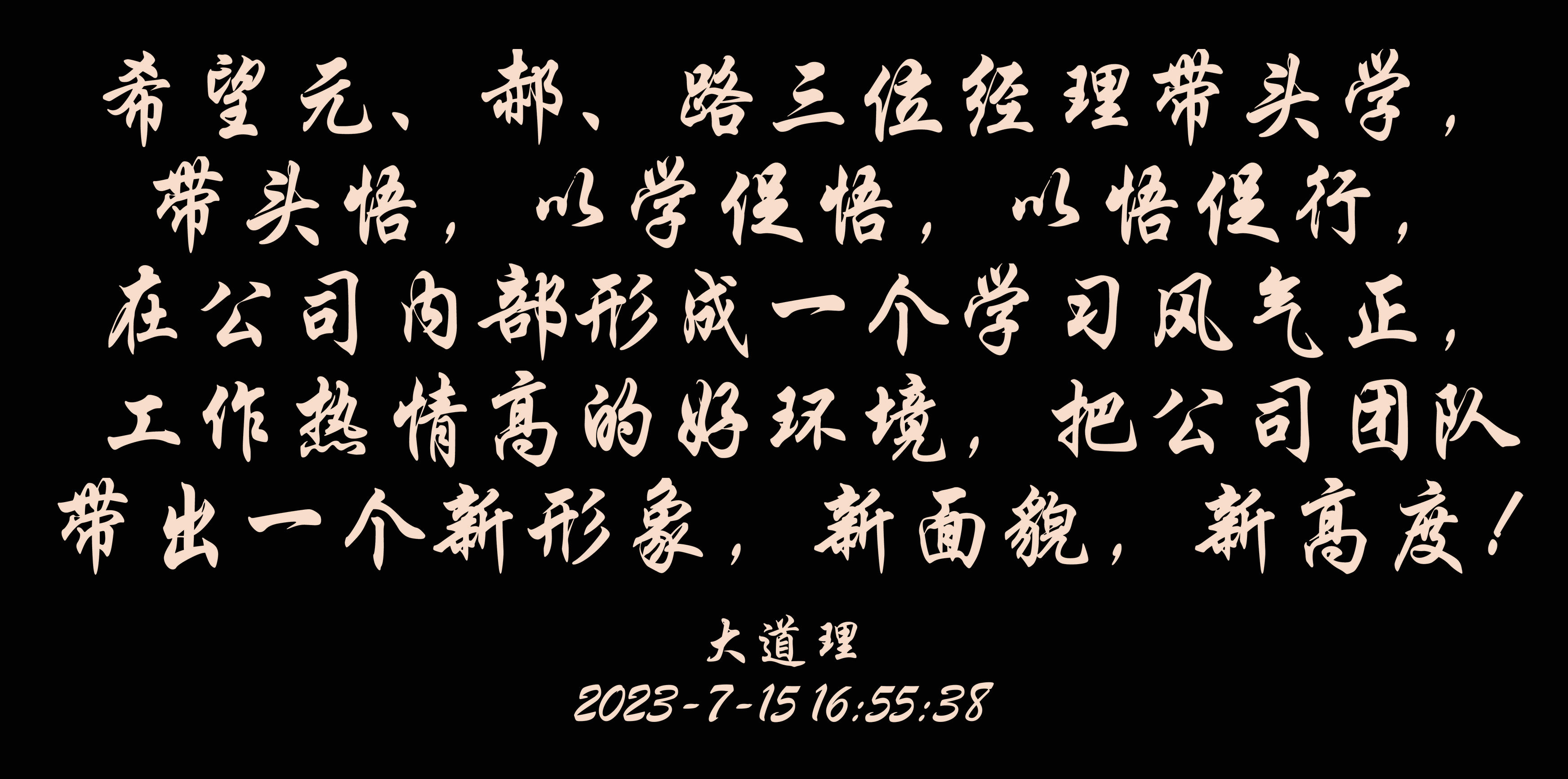 认真学习总书记讲话精神,深刻领会讲话核心内涵和要义,提高理解能力和执行能力,把太阳成tyc7111cc官网建设好是学习根本要求,希望元、郝、路三位经理带头学,带头悟,以学促悟,以悟促行,在公司内部形成一个学习风气正,工作热情高的好环境,把公司团队带出一个新形象,新面貌,新高度!