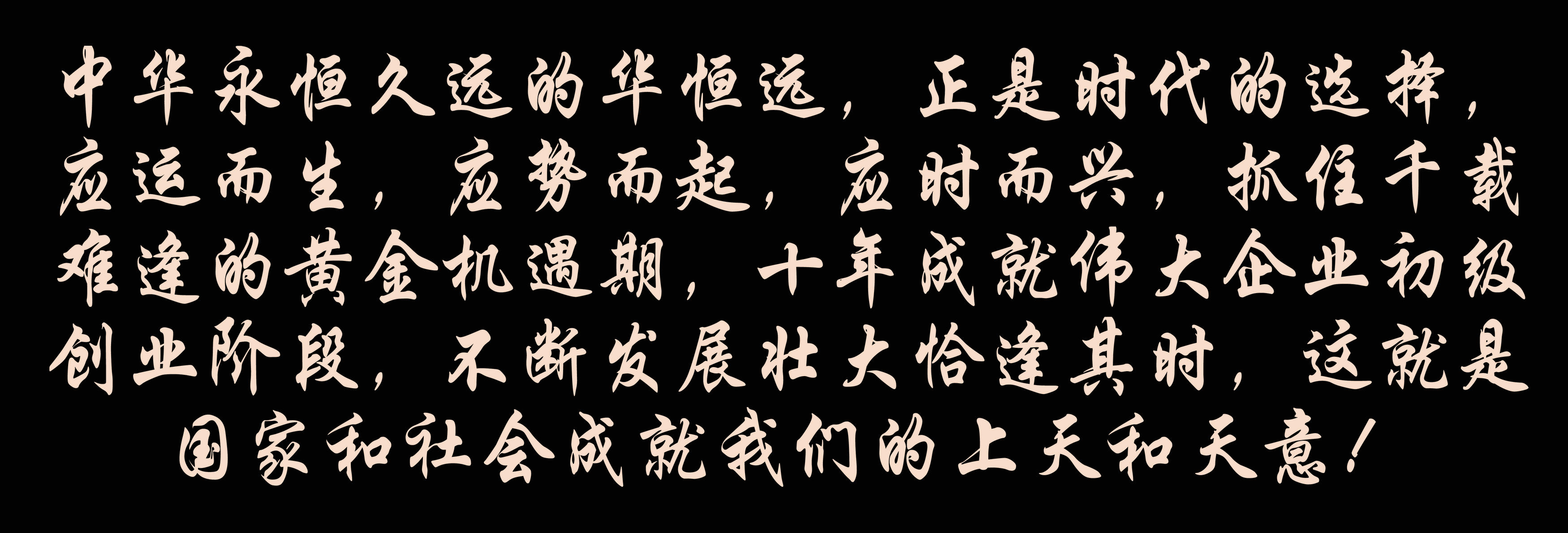 中华永恒久远的太阳成tyc7111cc官网,正是时代的选择,应运而生,应势而起,应时而兴,抓住千载难逢的黄金机遇期,十年成就伟大企业初级创业阶段,不断发展壮大恰逢其时,这就是国家和社会成就我们的上天和天意!