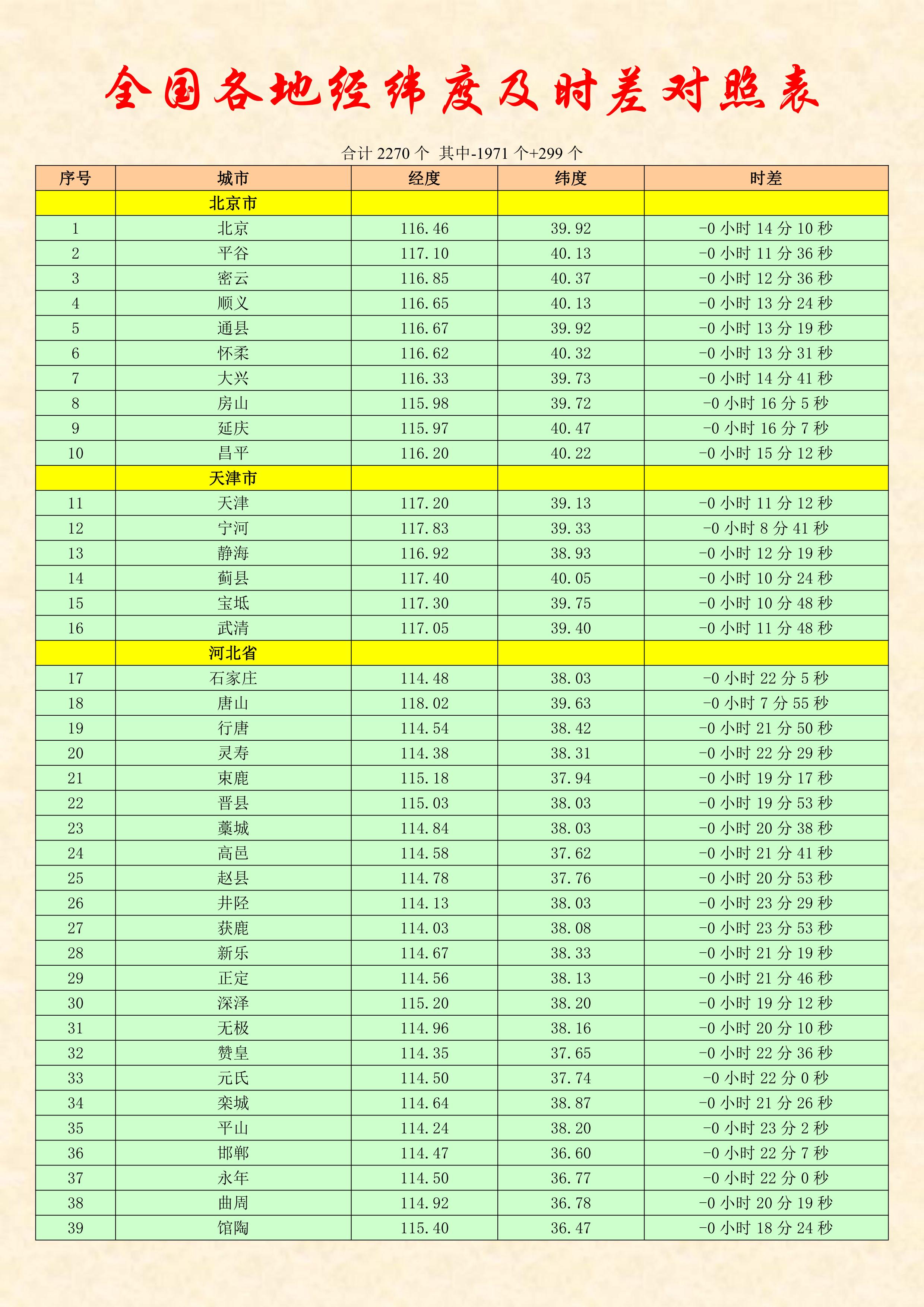 今天为什么要编辑《全国各地经纬度及时差对照表》呢?因为这个经纬度和时差与我们的所有谋略息息相关,可谓是成就未来必不可少的参考依据!什么时间做什么事情,提前不行,推后也不行,必须在恰当的时间和空间交汇点上行动,才能抓住应该得到的机遇获得成功!