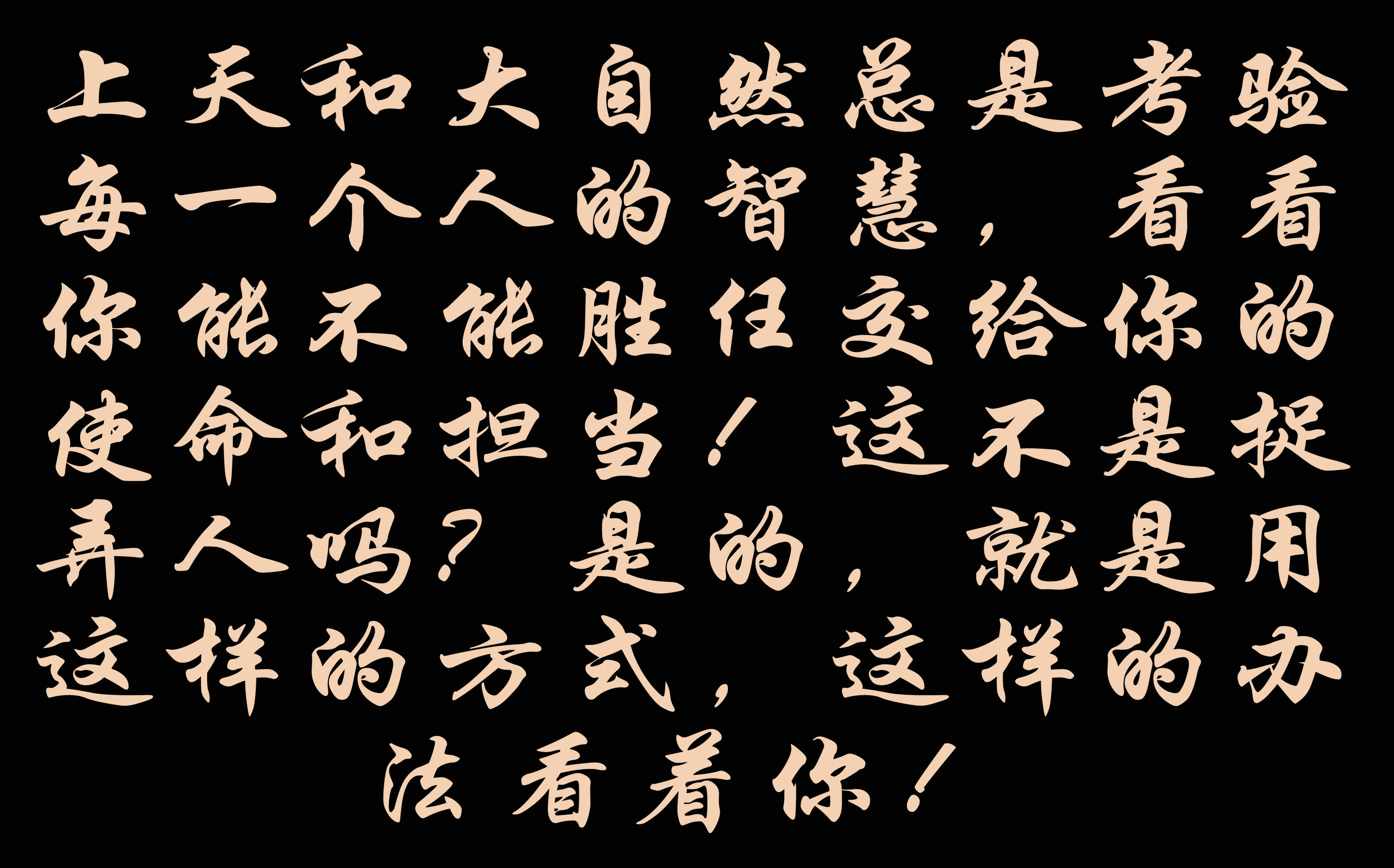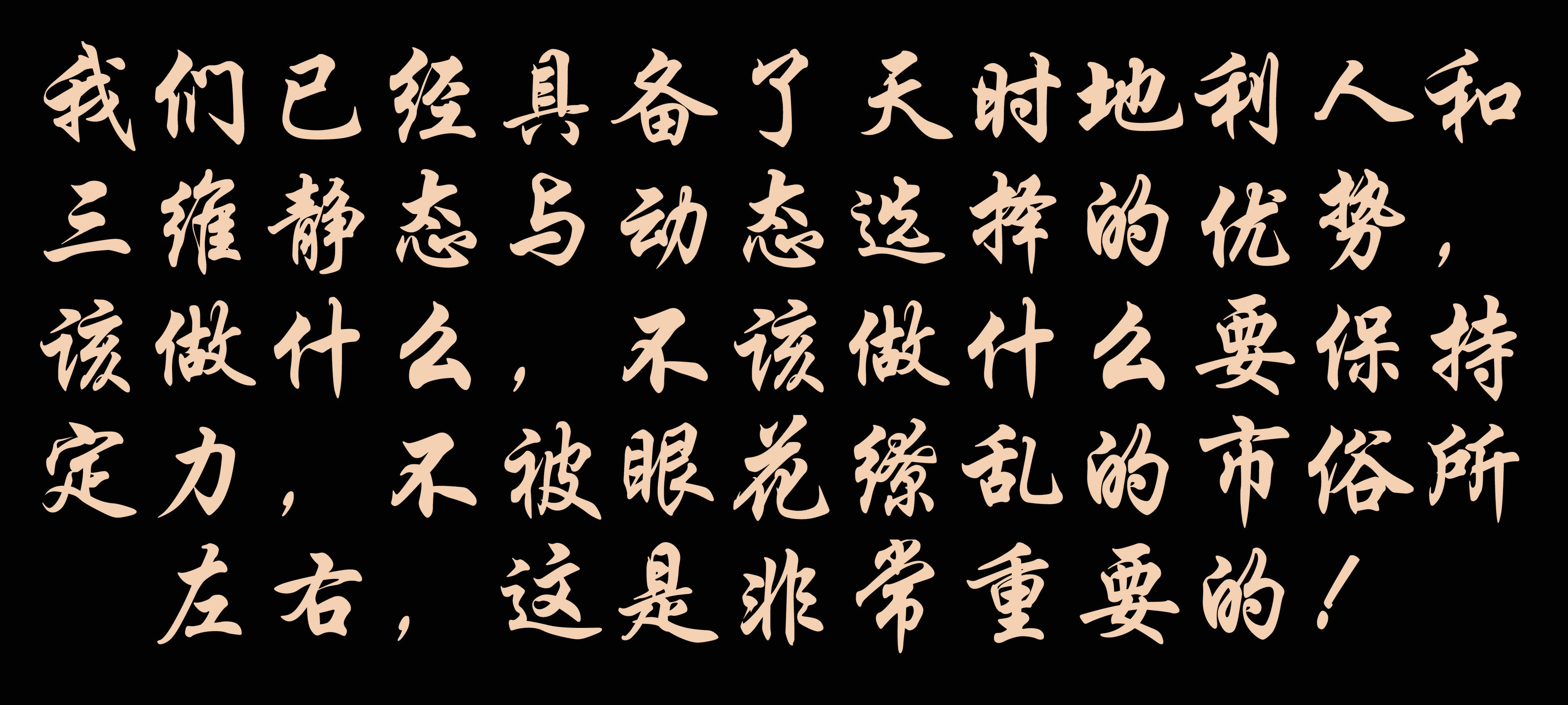 我们已经具备了天时地利人和三维静态与动态选择的优势,该做什么,不该做什么要保持定力,不被眼花缭乱的市俗所左右,这是非常重要的!上天和大自然总是考验每一个人的智慧,看看你能不能胜任交给你的使命和担当!这不是捉弄人吗?是的,就是用这样的方式,这样的办法看着你!