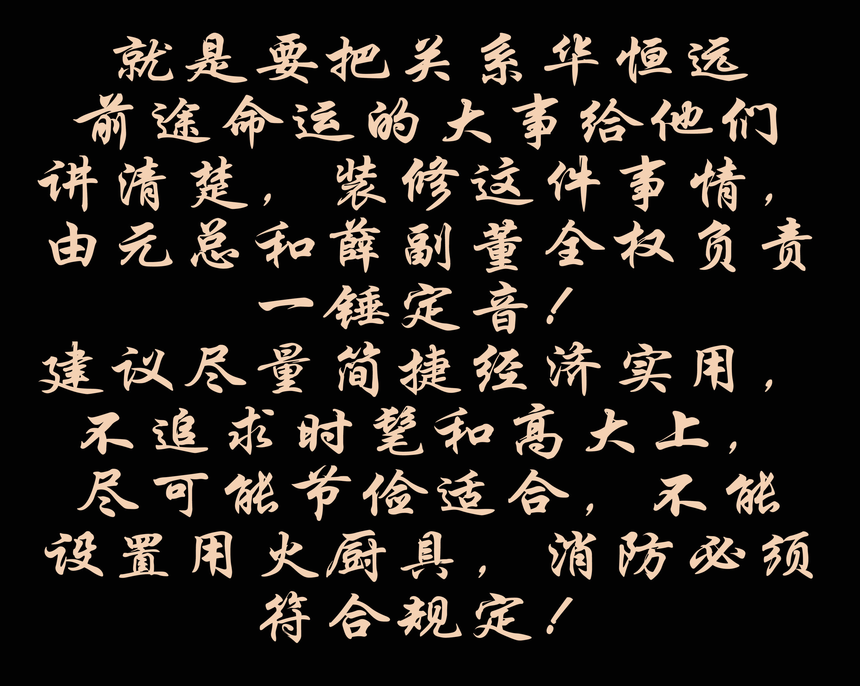 我下午约见董事长夫妇一晤,就是要把关系太阳成tyc7111cc官网前途命运的大事给他们讲清楚,装修这件事情,由元总和薛副董全权负责一锤定音!