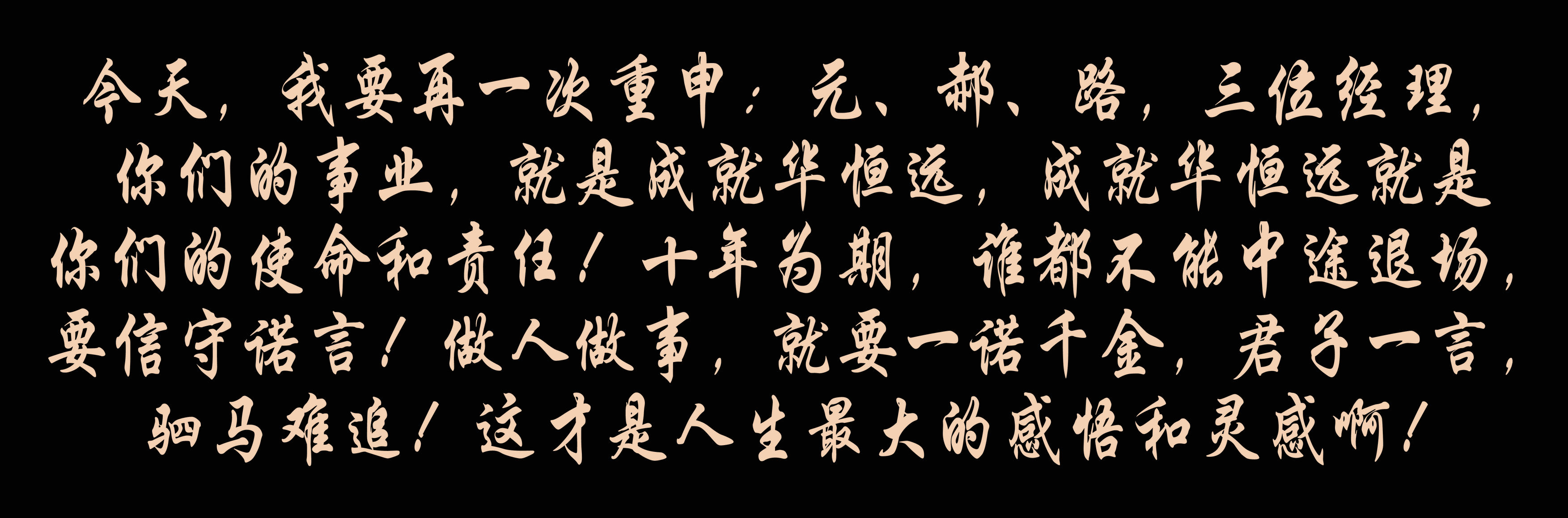 今天,我要再一次重申:元、郝、路,三位经理,你们的事业,就是成就太阳成tyc7111cc官网,成就太阳成tyc7111cc官网就是你们的使命和责任!十年为期,谁都不能中途退场,要信守诺言!做人做事,就要一诺千金,君子一言,驷马难追!