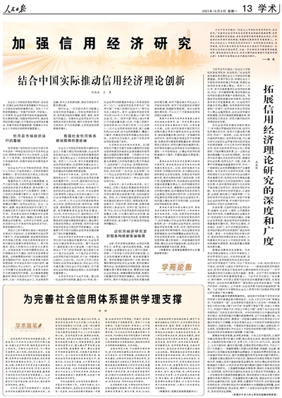 习近平总书记指出:“社会主义市场经济是信用经济、法治经济。”完善的社会信用体系是供需有效衔接的重要保障,是资源优化配置的坚实基础,是良好营商环境的重要组成部分,对促进国民经济循环高效畅通、构建新发展格局具有重要意义。如何认识社会主义市场经济是信用经济?如何促进信用理念、信用制度、信用手段与国民经济体系各方面各环节深度融合?如何深化信用经济理论研究,为进一步发挥信用对提高资源配置效率、降低制度性交易成本、防范化解风险的重要作用提供学理支撑?本期学术版围绕这些问题进行探讨。