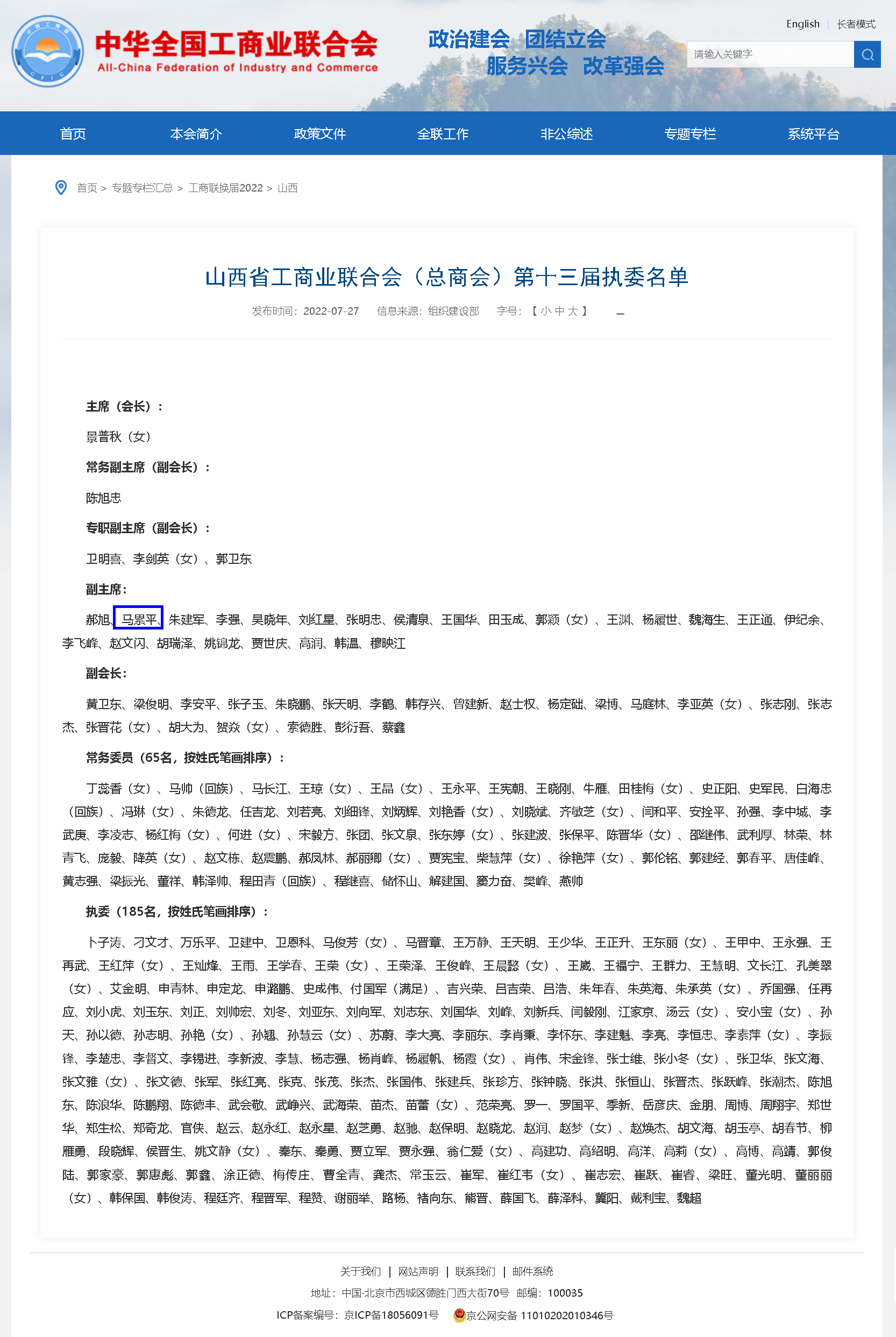 2017年——第十二届山西省工商业联合会副主席、山西省民营企业资产置换协会会长、山西恒圆星实业集团有限公司董事长、山西亿物商务信息咨询有限公司董事长