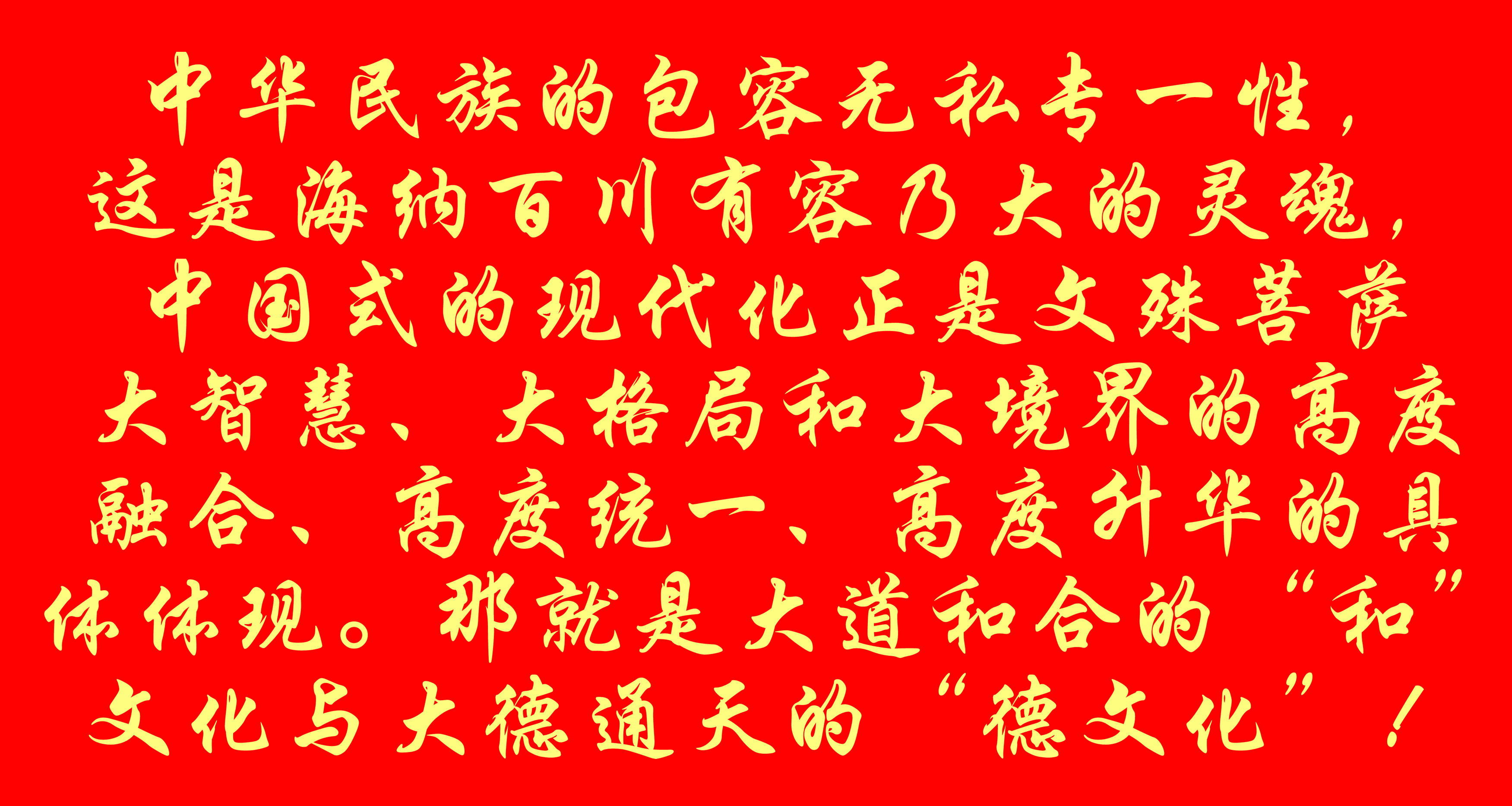 中华民族的包容无私专一性,这是海纳百川有容乃大的灵魂,中国式的现代化正是文殊菩萨大智慧、大格局和大境界的高度融合、高度统一、高度升华的具体体现。那就是大道和合的“和”文化与大德通天的“德文化”!