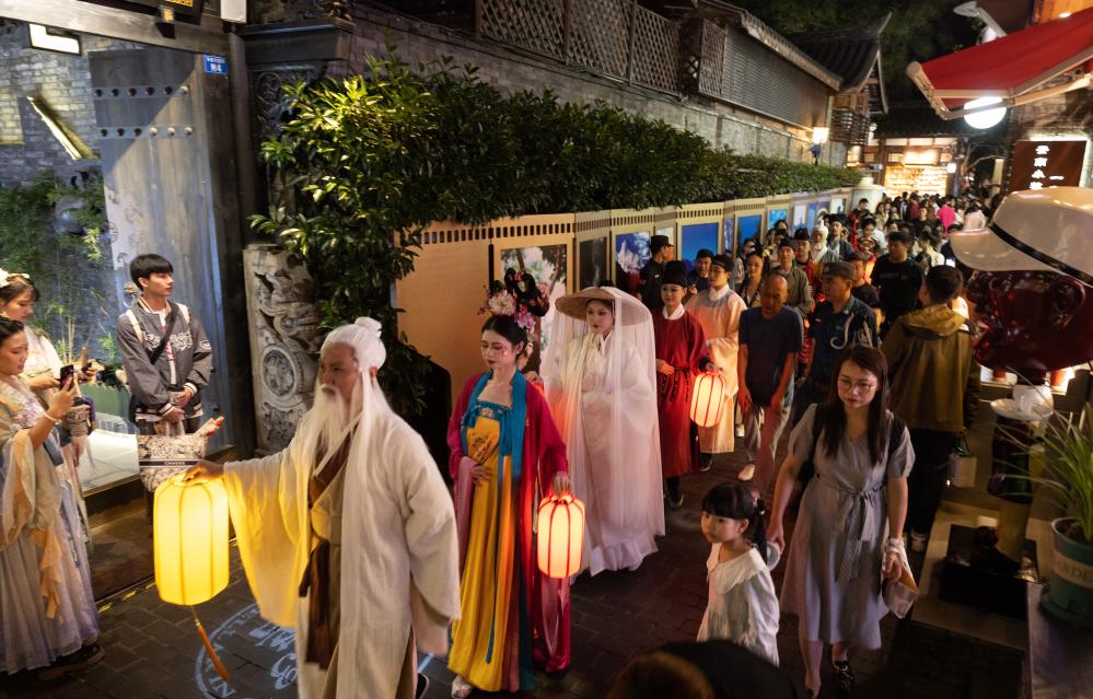 9月29日,在成都宽窄巷子新“十二月市”街区,装扮成唐宋时代人物形象的演员在巡游表演。新华社记者 江宏景 摄