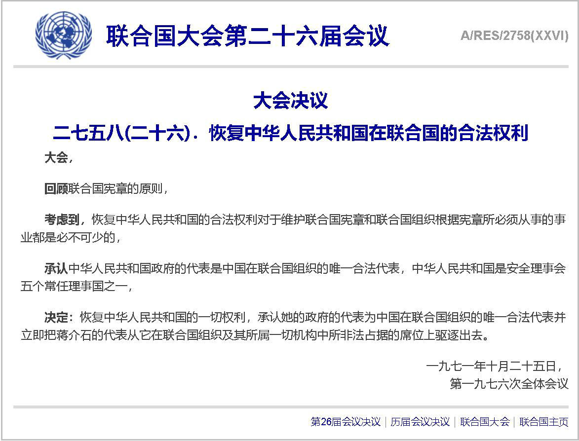 33. A/RES/2758(XXVI)+HTML 恢复中华人民共和国在联合国的合法权利 1971