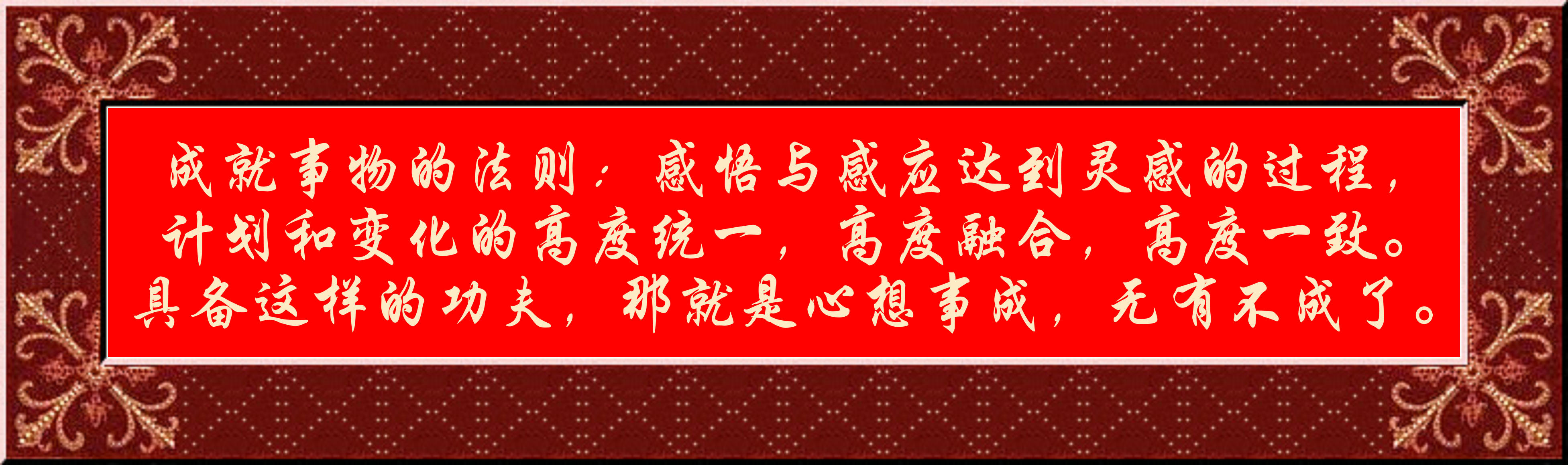 什么时候做什么事,几月几日,哪个季节,时间地点,分秒不差。这就是成就事物的法则:感悟与感应达到灵感的过程,计划和变化的高度统一,高度融合,高度一致。具备这样的功夫,那就是心想事成,无有不成了。