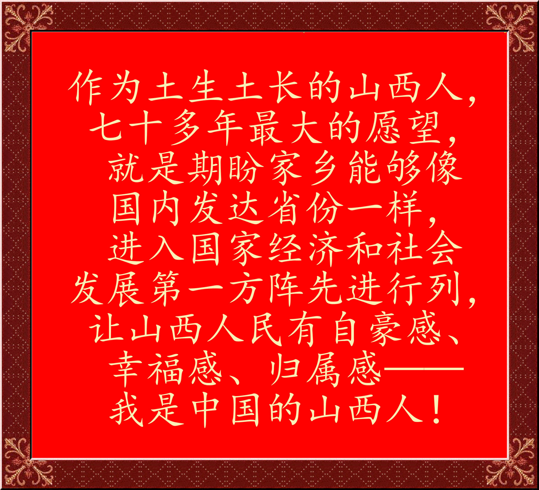 作为土生土长的山西人,七十多年最大的愿望,就是期盼家乡能够像国内发达省份一样,进入国家经济和社会发展第一方阵先进行列,让山西人民有自豪感、幸福感、归属感——我是中国的山西人!