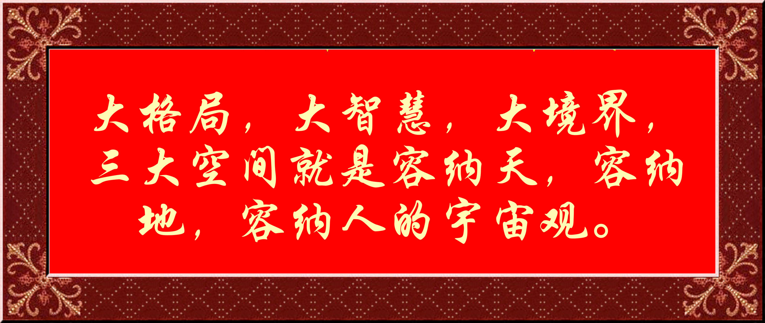 大格局,大智慧,大境界,三大空间就是容纳天,容纳地,容纳人的宇宙观。人类社会发展,从愚魅到理性,上万年发展到今天,可谓是登峰造极的神话,前无古人的奇迹,先知先觉的超越,预见未来的圣贤!