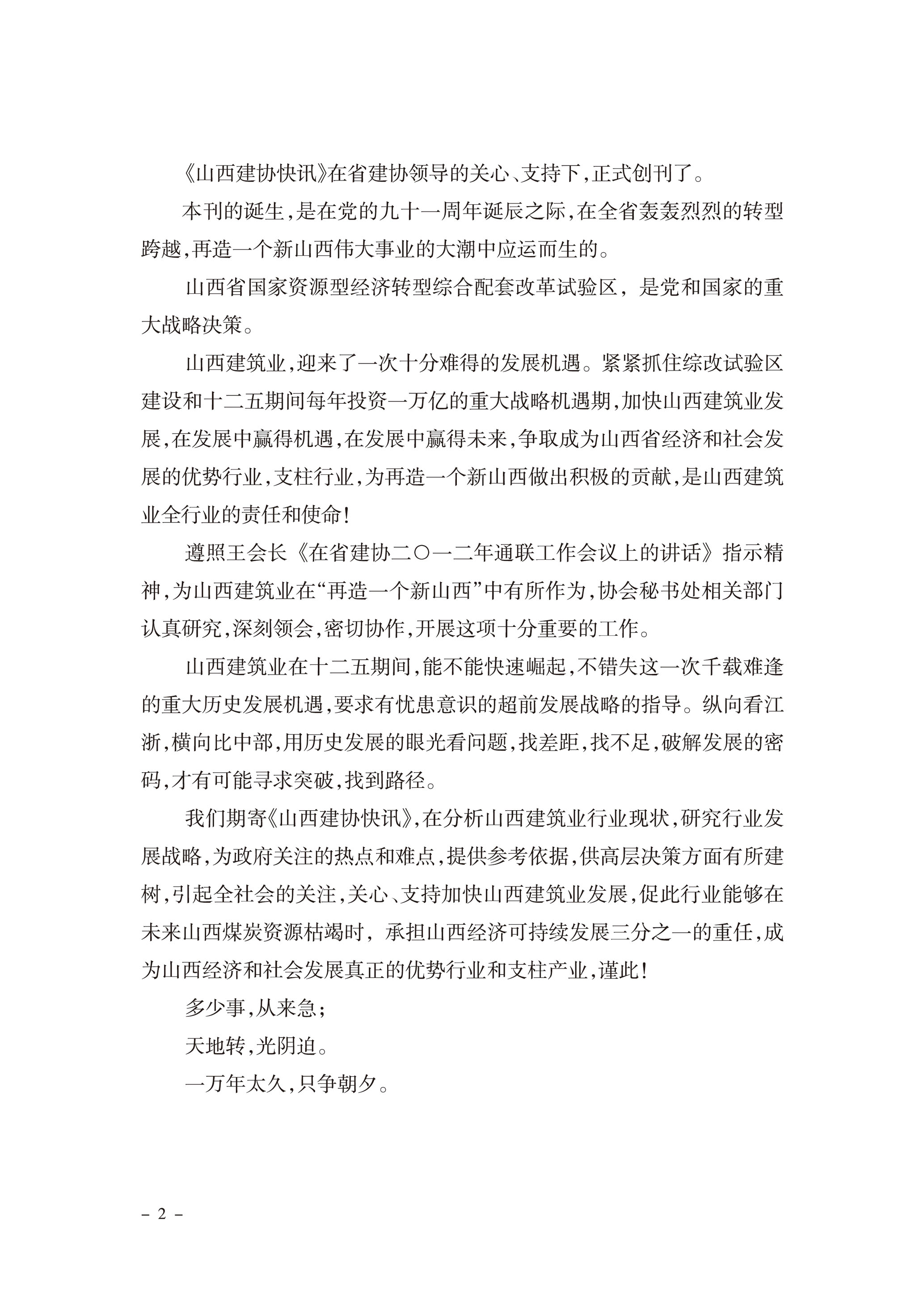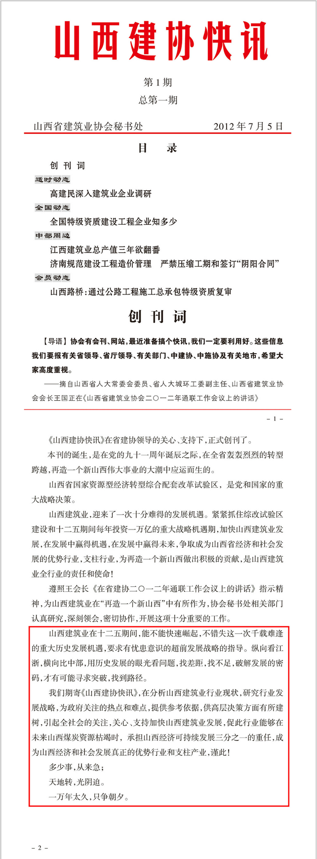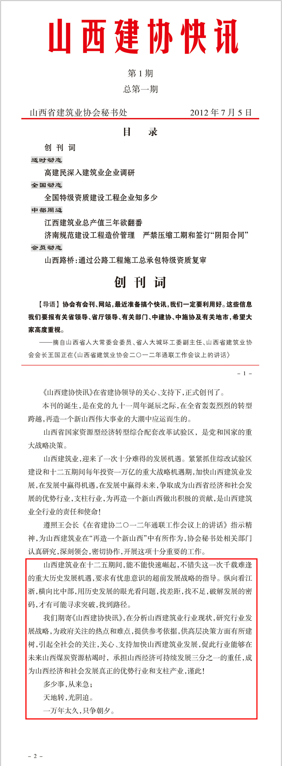 这是我在担任山西省建筑业协会首任信息传媒部主任时,亲自撰写的《山西建协快讯》创刊词。 十二年后的今天重新感悟,依然具有重要意义和时代价值。