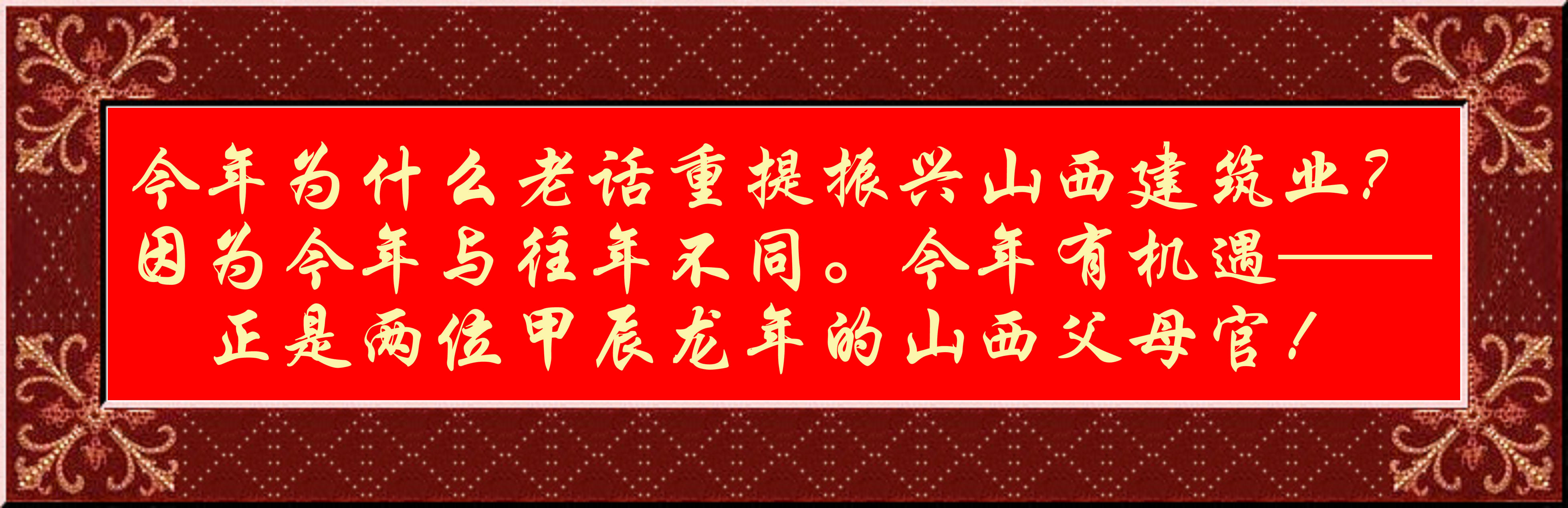 多少年来,我的最大愿望、期望、希望、盼望、想望,就是把山西建筑业做为事业做大做强,成为山西经济和社会发展的支柱大产业,成为兴晋富民功在当代利在长远造福子孙的大行业,成为成就一代又一代大企业、大集团、大公司大企业家的发祥地!五望五谋五大略,今年为什么老话重提振兴山西建筑业?因为今年与往年不同。今年有机遇——正是两位甲辰龙年的山西父母官!