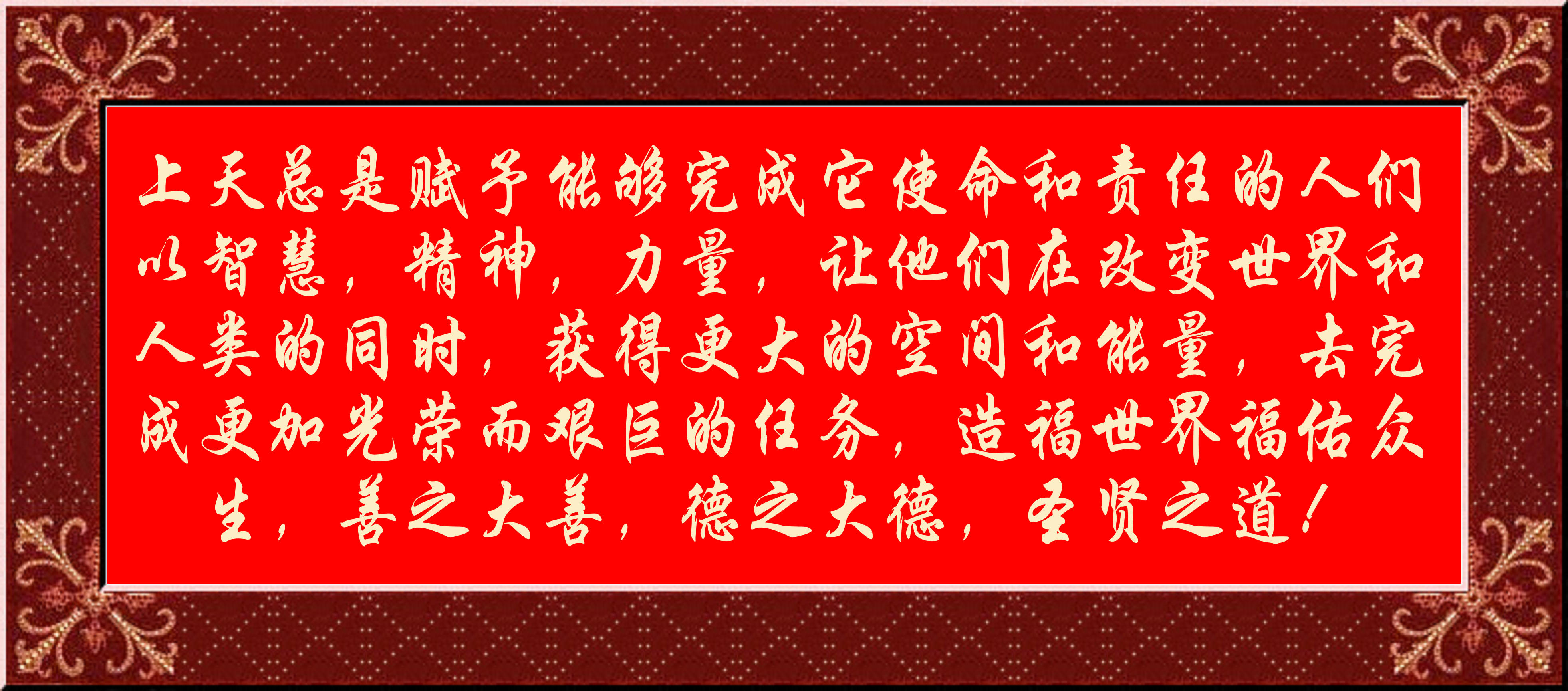 上天总是赋予能够完成它使命和责任的人们以智慧,精神,力量,让他们在改变世界和人类的同时,获得更大的空间和能量,去完成更加光荣而艰巨的任务,造福世界福佑众生,善之大善,德之大德,圣贤之道!