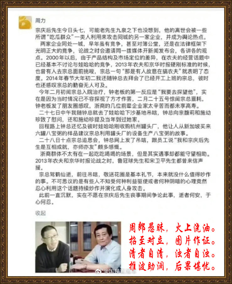 同行是冤家,一山难容二虎,这两句老话人人皆知却又人人不懂,其中的根源还是一个利益的纠葛和矛盾, 钟睒睒显然不具备大智慧的格局和境界!而他的同僚意气用事更把事情复杂化,直接加剧了矛盾进一步激化,形成了一种文化和理念上的冲突在所难免!因为已经上升到社会现象的局面,任何一方都无法控制和左右事态发展的节奏和后果了!
