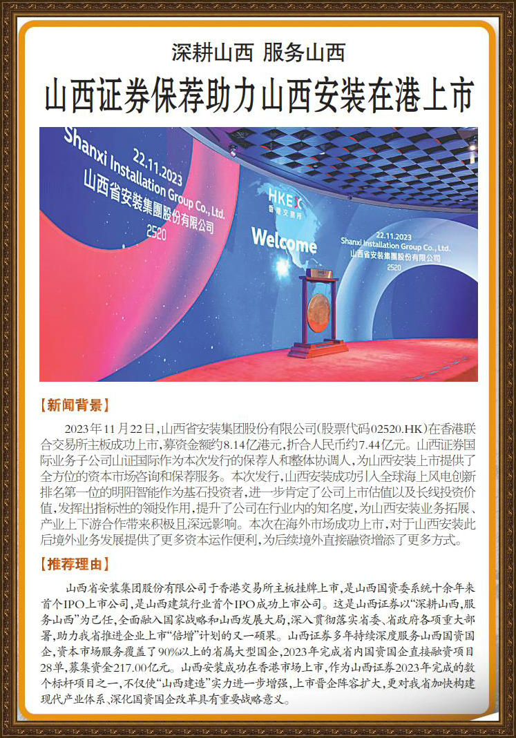 山西省安装集团股份有限公司于香港交易所主板挂牌上市,是山西国资委系统十余年来首个IPO上市公司,是山西建筑行业首个IPO成功上市公司。这是山西证券以“深耕山西,服务山西”为己任,全面融入国家战略和山西发展大局,深入贯彻落实省委、省政府各项重大部署,助力我省推进企业上市“倍增”计划的又一硕果。山西证券多年持续深度服务山西国资国企,资本市场服务覆盖了90%以上的省属大型国企,2023年完成省内国资国企直接融资项目28单,募集资金217.00亿元。山西安装成功在香港市场上市,作为山西证券2023年完成的数个标杆项目之一,不仅使“山西建造”实力进一步增强,上市晋企阵容扩大,更对我省加快构建现代产业体系、深化国资国企改革具有重要战略意义。