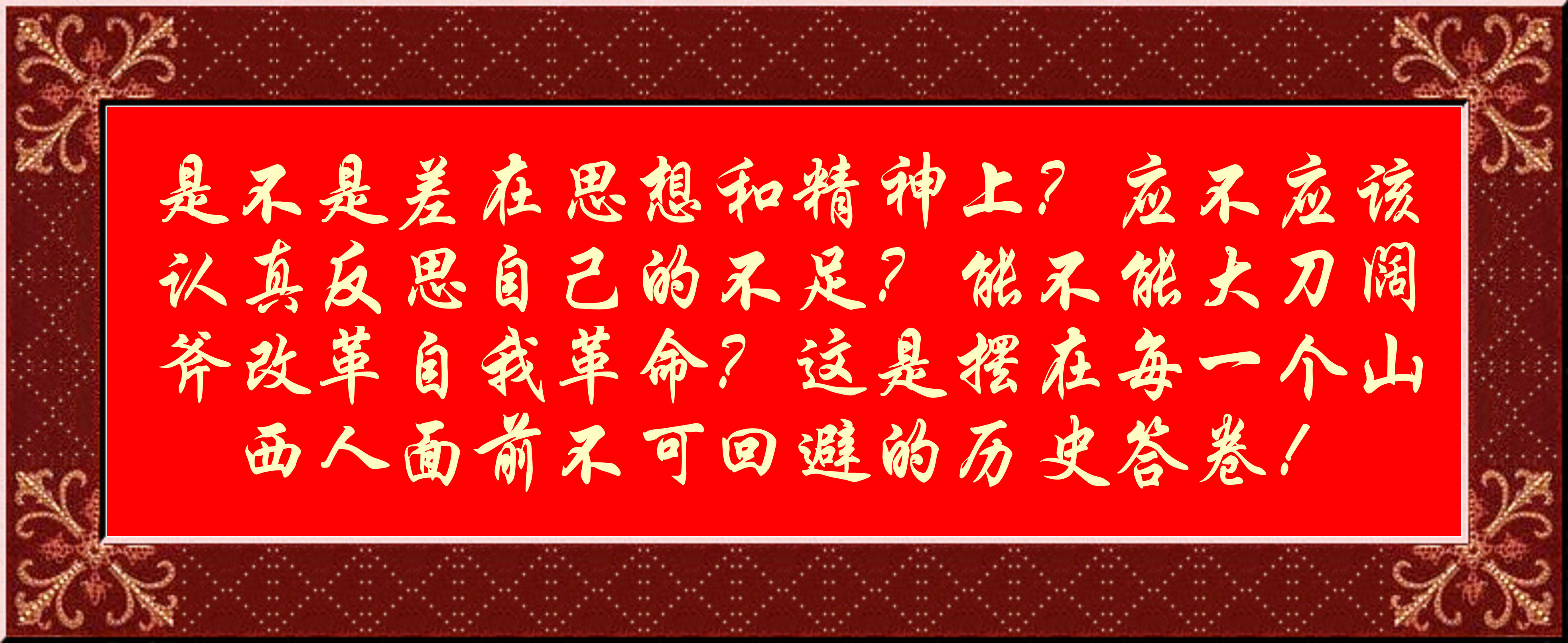 是不是差在思想和精神上?应不应该认真反思自己的不足?能不能大刀阔斧改革自我革命?这是摆在每一个山西人面前不可回避的历史答卷!