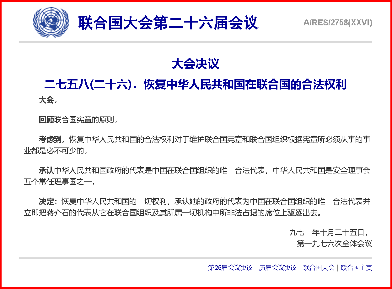 王毅说,台湾是中国领土不可分割的一部分,这既是历史,也是现实。《开罗宣言》《波茨坦公告》明确规定把日本窃取的中国领土,包括台湾、澎湖列岛归还中国,构成了二战后国际秩序的重要组成部分。53年前,就是在这座神圣庄严的大厅,第26届联合国大会以压倒性多数通过第2758号决议,决定恢复中华人民共和国在联合国的一切权利,承认中华人民共和国政府代表是中国在联合国唯一合法代表,并立即把台湾地区的代表从联合国及其所属一切机构中驱逐出去。这一决议彻底解决了包括台湾在内全中国在联合国的代表权问题,明确不存在“两个中国”,不存在“一中一台”。在这一原则问题上,没有灰色地带,没有模糊空间。中国必将实现完全统一,台湾必将回归祖国怀抱,这是任何人、任何势力都阻挡不了的历史大势!