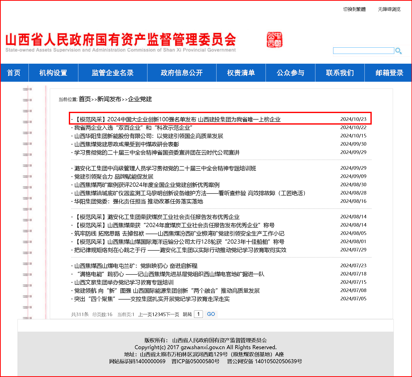1 【模范风采】2024中国大企业创新100强名单发布山西建投集团为我省唯一上榜企业 2024/10/23