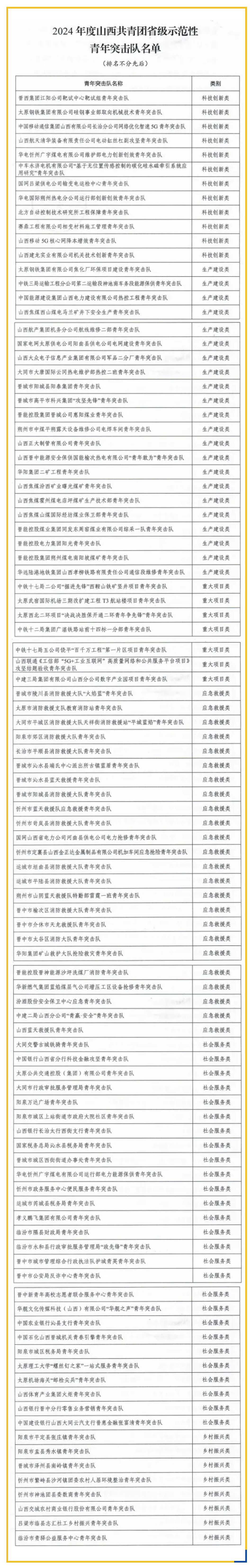 本报讯(记者李炼)12月16日,记者从团省委获悉,2024年度山西共青团省级示范性青年突击队名单公布,共有100支青年突击队上榜。