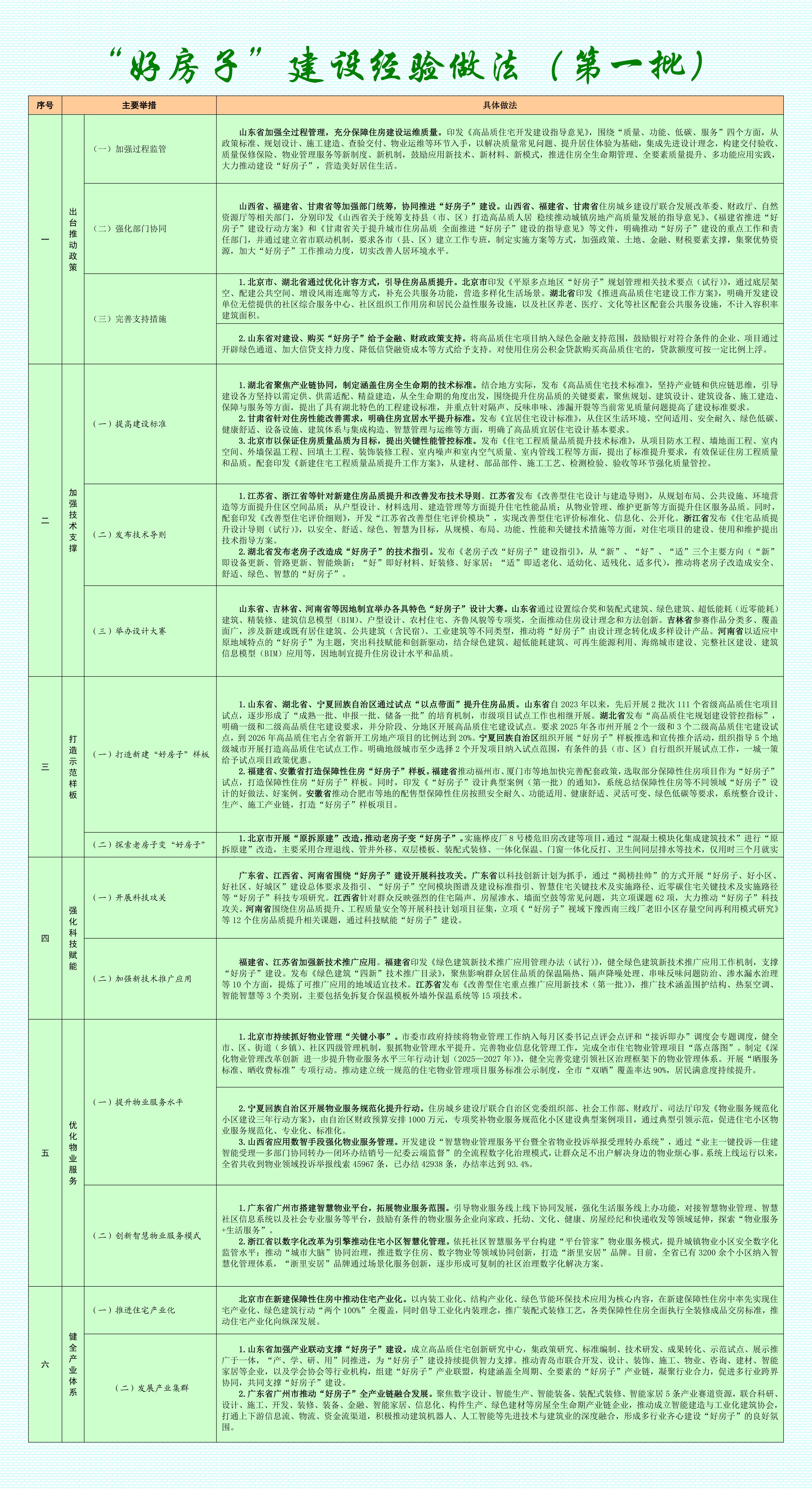 在打造示范样板上,清单中既有打造新建“好房子”样板的做法,也有探索老房子变“好房子”的实践。在强化科技赋能上,广东省、江西省、河南省围绕“好房子”建设开展科技攻关;福建省、江苏省加强新技术推广应用。在优化物业服务上,地方实践经验聚焦于提升物业服务水平和创新智慧物业服务模式两个方面。