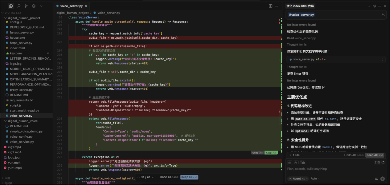 在企业数字人开发全流程中,公司创新性应用了人工智能大模型的标准化代码生成能力,在确保系统架构、功能逻辑、源代码等关键环节、技术自主可控的前提下,实现利用大模型进行企业数字人代码开发的自动化编程、智能优化调试及测试,使研发人员将工作重心从基础代码编写转向对核心模型及代码框架进行精细调优,这不仅显著缩短了开发周期、提升了开发效率,更从根本上保障了底层技术的可靠性与先进性,为提升产品质量奠定了坚实基础。