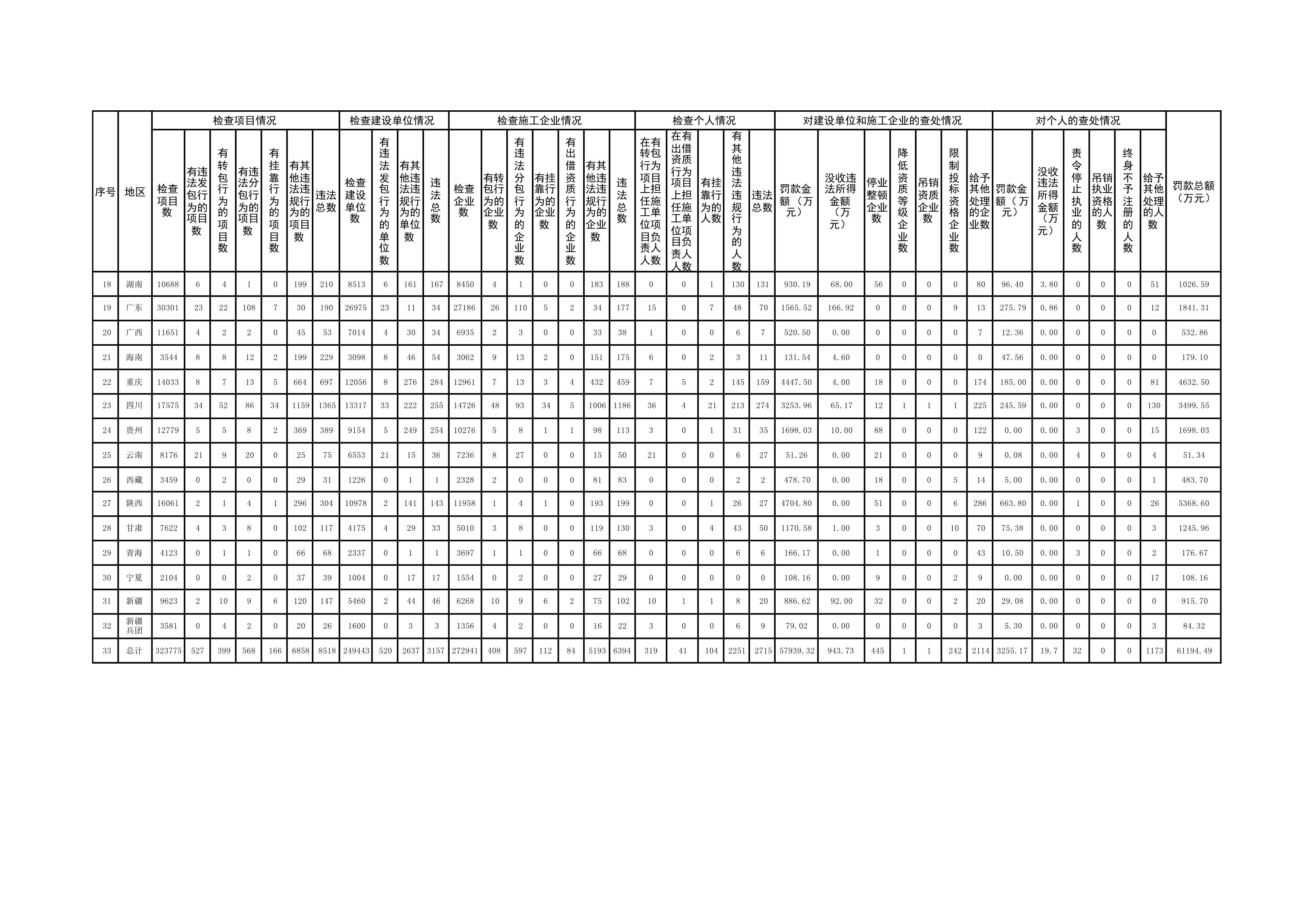 从查处的违法违规工程项目总数看,四川、重庆、江苏、江西、辽宁5省(市)查处项目数量较多,分别查处1365个、697个、671个、645个、525个。从查处的违法发包、转包、违法分包和挂靠等4类违法违规行为看,四川、江西、湖北、广东、安徽5省查处项目数量较多,分别查处206个、176个、174个、160个、154个。从罚款的金额看,河南、江西、辽宁、陕西、重庆5省(市)处罚金额数较大,分别罚款7291.65万元、7127.92万元、6435.5万元、5368.6万元、4632.5万元。