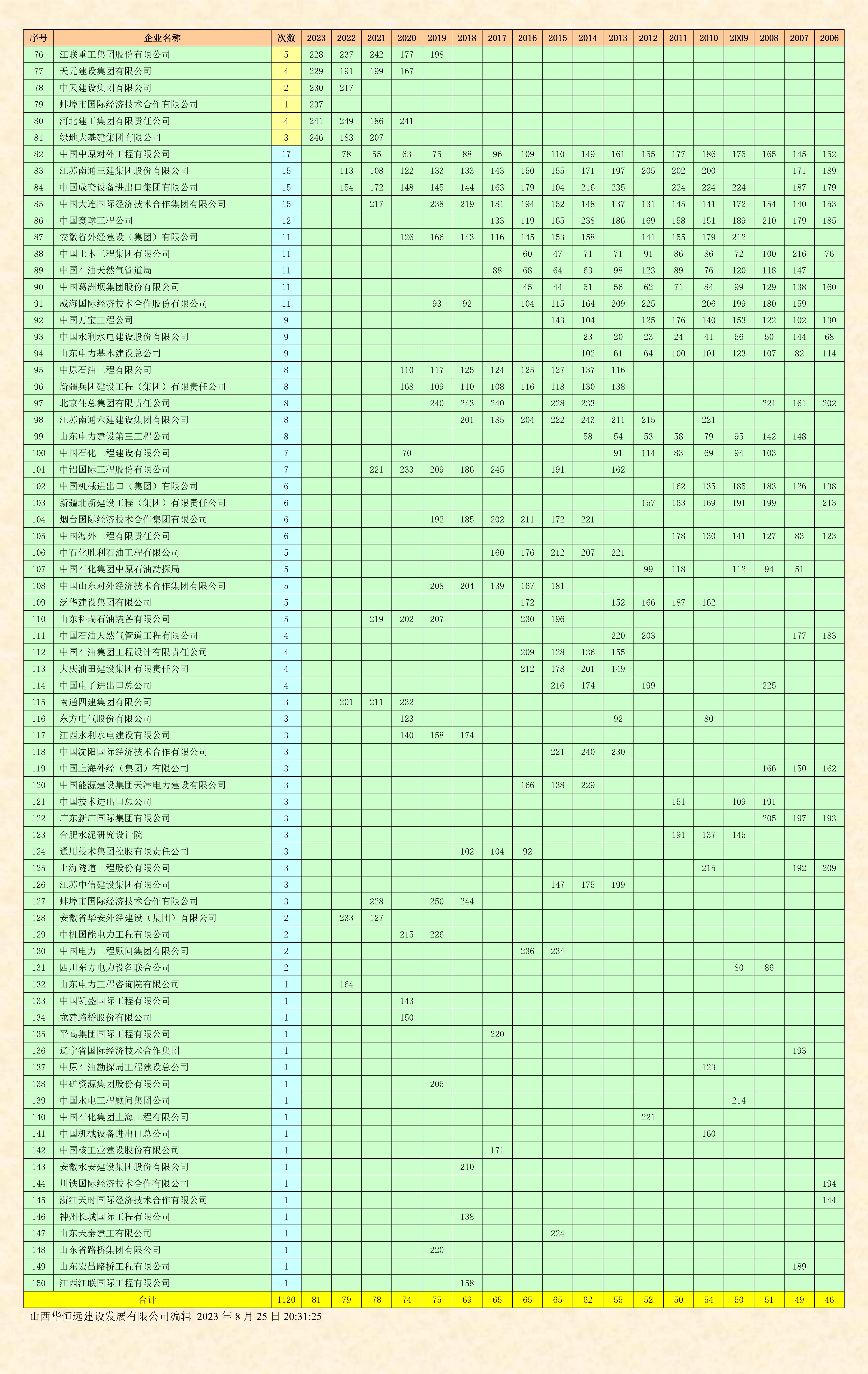 据悉,美国《工程新闻纪录》(ENR)杂志是全球工程建设领域最权威的学术杂志,其每年发布的“全球承包商250强”和“国际承包商250强”榜单被誉为国际工程界的“晴雨表”,是建筑行业公认的、较为全面反映年度全球建筑市场发展状况的权威排名。其中,全球榜单根据企业的整体营业额进行排名,反映了企业的整体营业能力。国际榜单根据企业海外业务营业额,即本国以外的国际市场完成的营业额进行排名,反映了企业在国际市场上的竞争力。