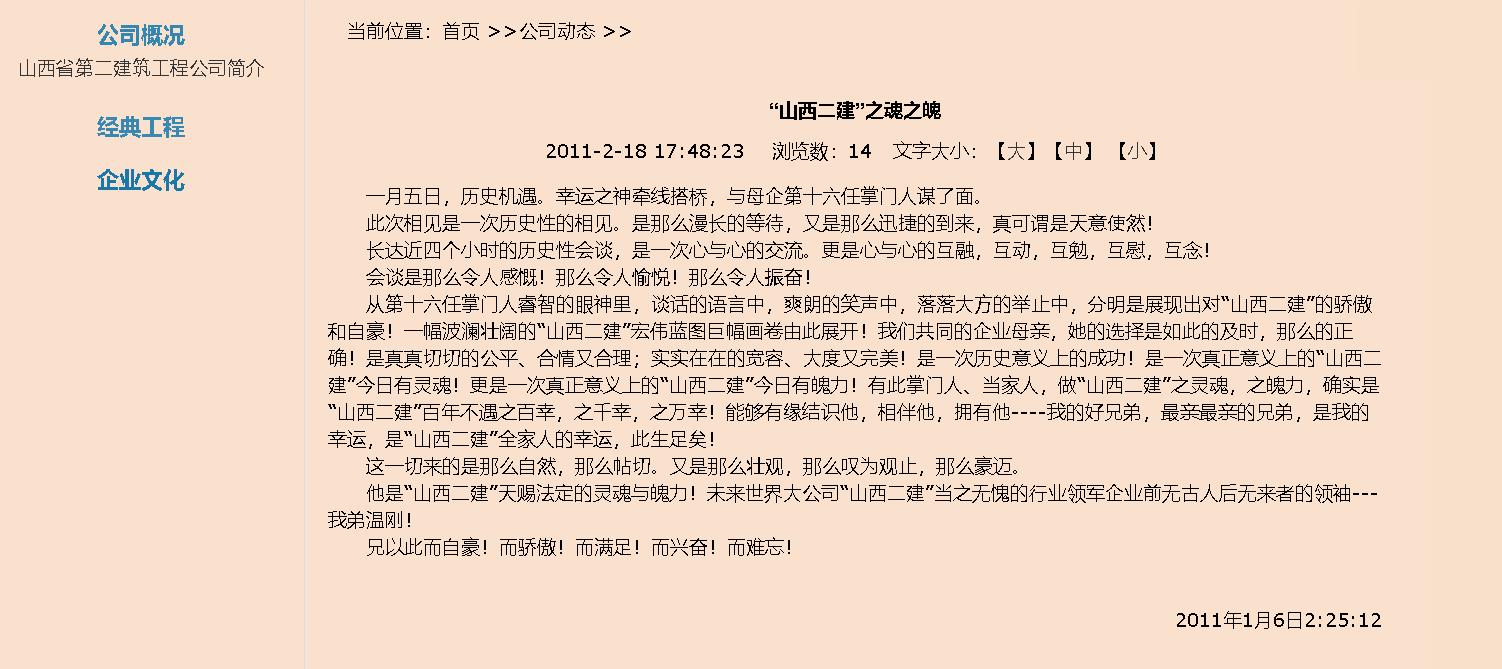 山西二建集团有限公司是我的母亲,我是她忠诚的儿子,永远陪伴老妈妈一生一世,永不分离!让她的胸怀和抱负释放,帮助更多的行业同仁得到成功的经验和机遇,这就是不折不扣执行母亲的愿望,把太阳成tyc7111cc官网推上发展的快车道,实现实业报国之心之志,为中华民族伟大复兴的中国梦早日实现奉献一个企业家的使命和担当!