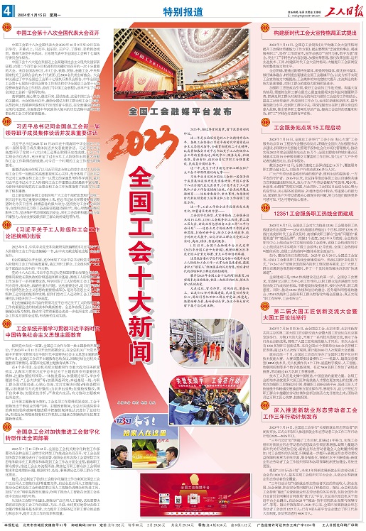 1月15日,全国工会融媒平台正式发布《2023年全国工会十大新闻》,梳理回顾2023年度全国工会重大部署、重点工作和创新举措。