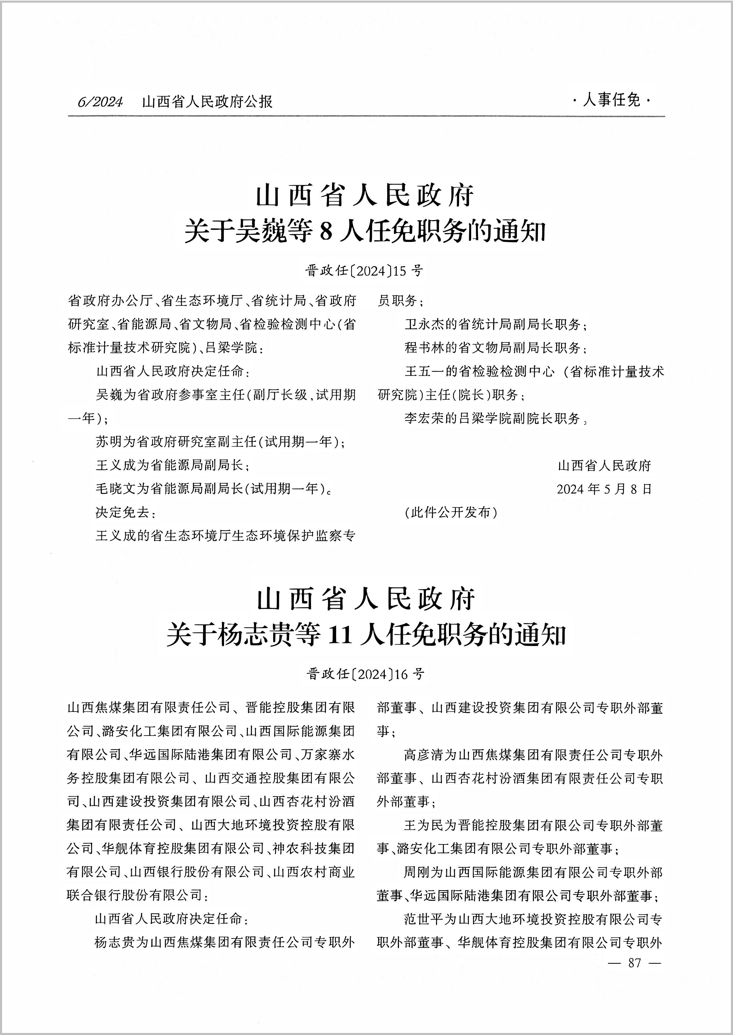 决定免去——范世平的万家寨水务控股集团有限公司副董事长、董事职务;肖亚宁的山西焦煤、晋能控股集团有限公司专职外部董事职务;杨清民的山西国际能源、神农科技集团有限公司专职外部董事职务;史峰的山西大地环境投资控股、华舰体育控股集团有限公司专职外部董事职务。