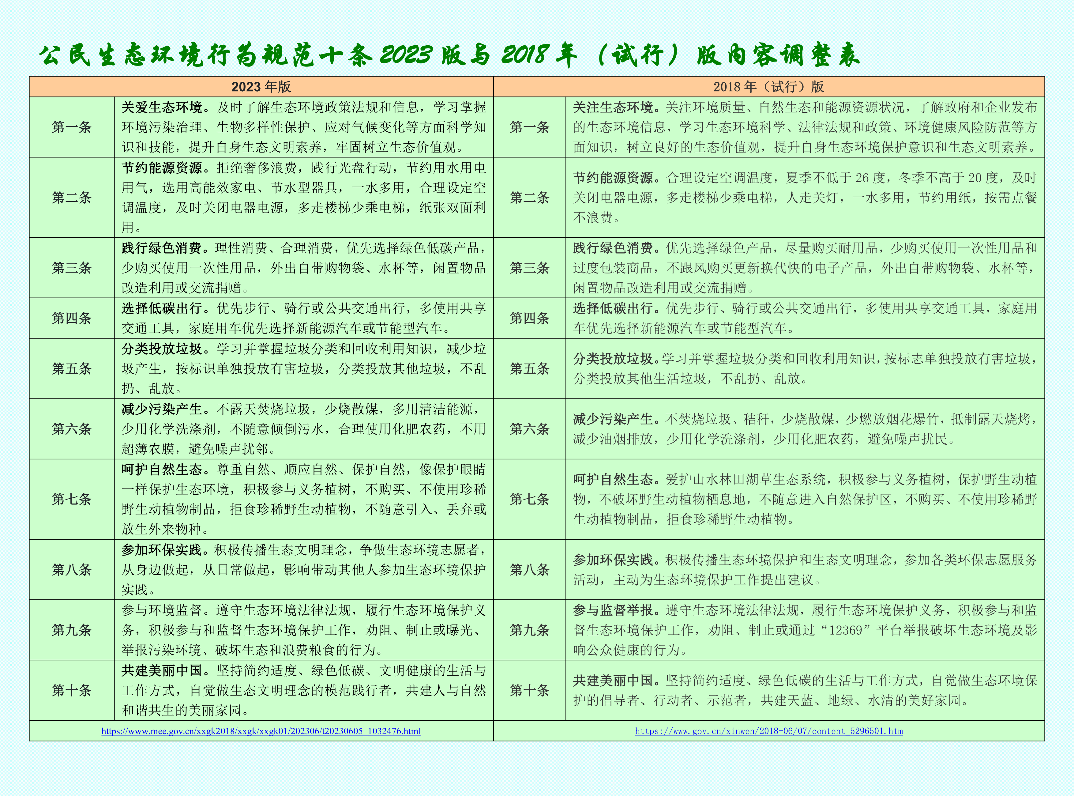 公民生态环境行为规范十条2023版与2018年试行版调整表