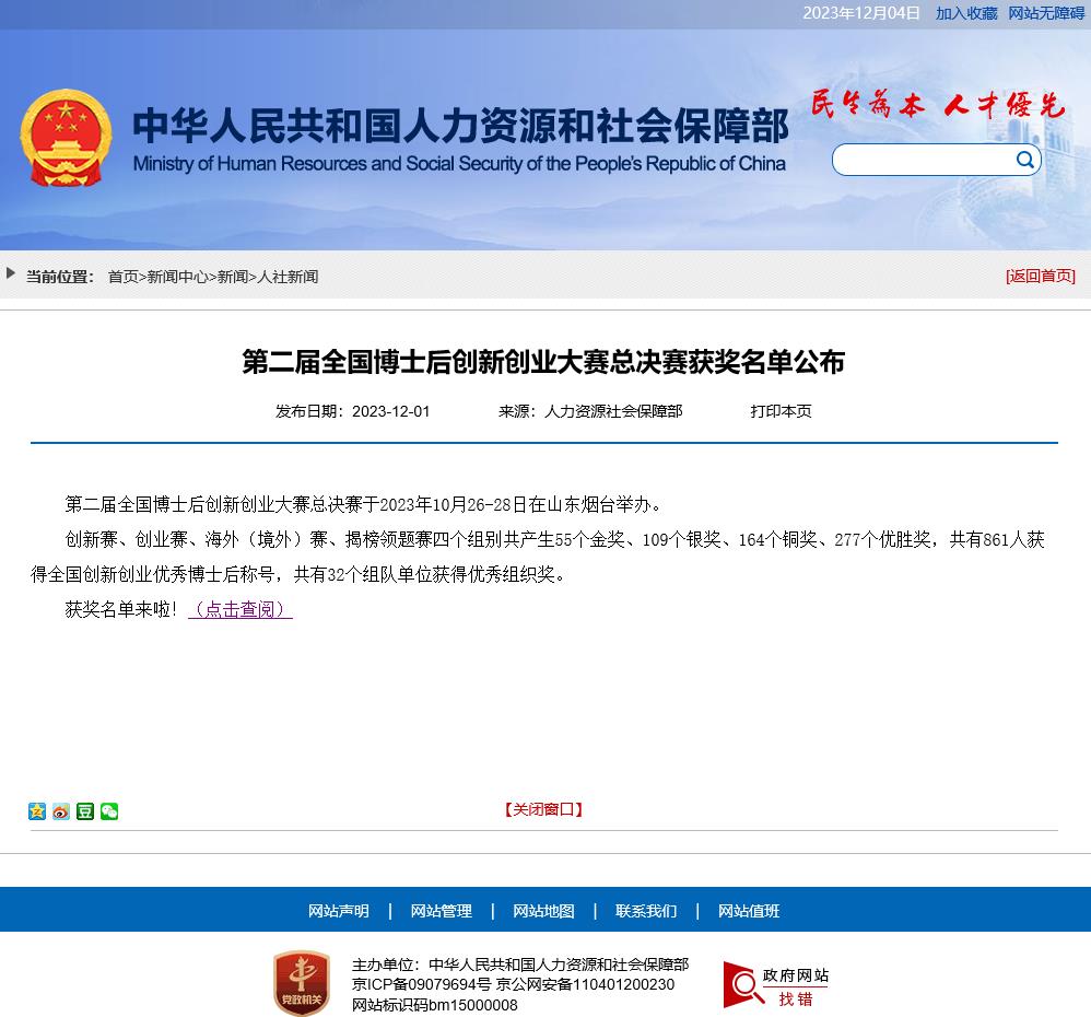创新赛、创业赛、海外(境外)赛、揭榜领题赛四个组别共产生55个金奖、109个银奖、164个铜奖、277个优胜奖,共有861人获得全国创新创业优秀博士后称号,共有32个组队单位获得优秀组织奖。