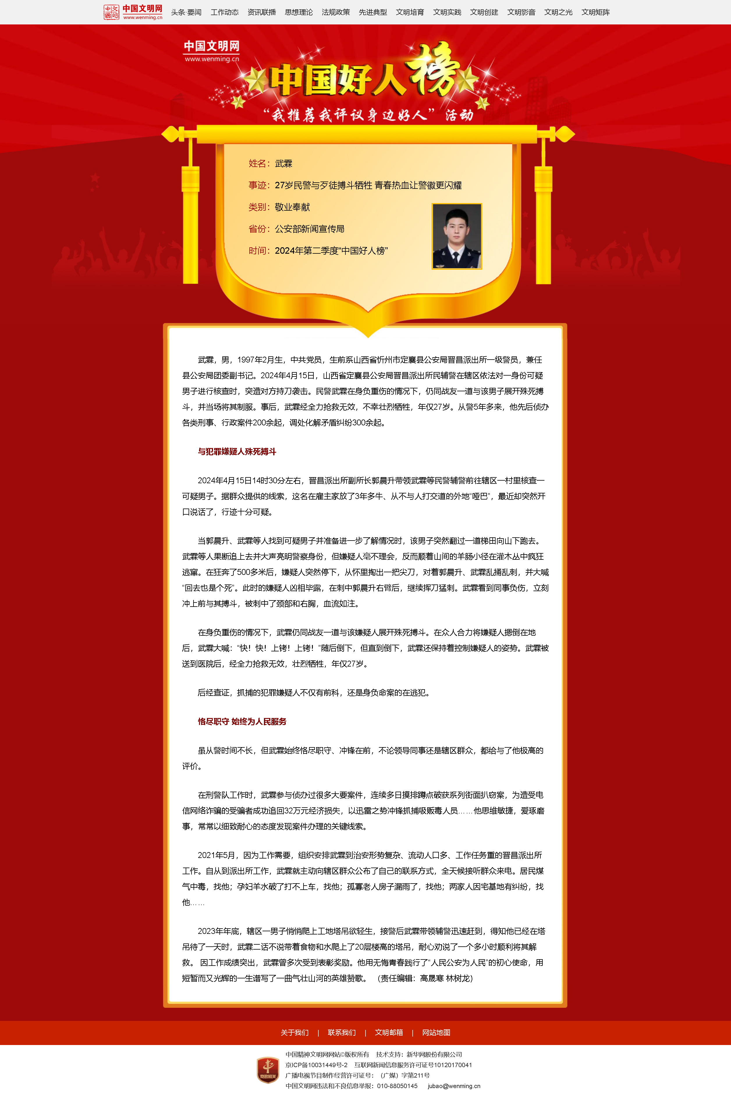 7月30日下午,2024年第二季度“中国好人榜”发布仪式暨全国道德模范与身边好人现场交流活动在大同市举行。经行业系统和各地推荐、网友点赞评议、专家评审等环节,共有153人(组)助人为乐、见义勇为、诚实守信、敬业奉献、孝老爱亲身边好人光荣上榜,山西省忻州市定襄县公安局晋昌派出所牺牲民警武霖入选“敬业奉献”好人。