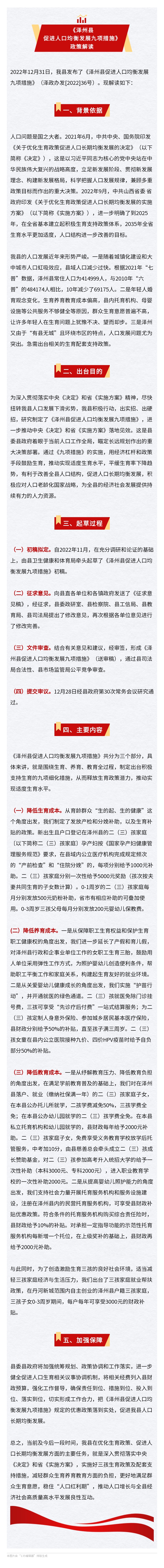 解读文章称,《泽州县促进人口均衡发展九项措施》是县委县政府着眼于当前人口工作全局,瞄定长远规划作出的重大决策部署。通过《九项措施》的实施,用经济杠杆和政策手段鼓励生育,推动实现适度生育水平,平缓生育率下降趋势,有利于改善全县人口结构,促进人口长期均衡发展,积极应对人口老龄化国家战略,为全县的经济社会发展提供持续有力的人力资源。