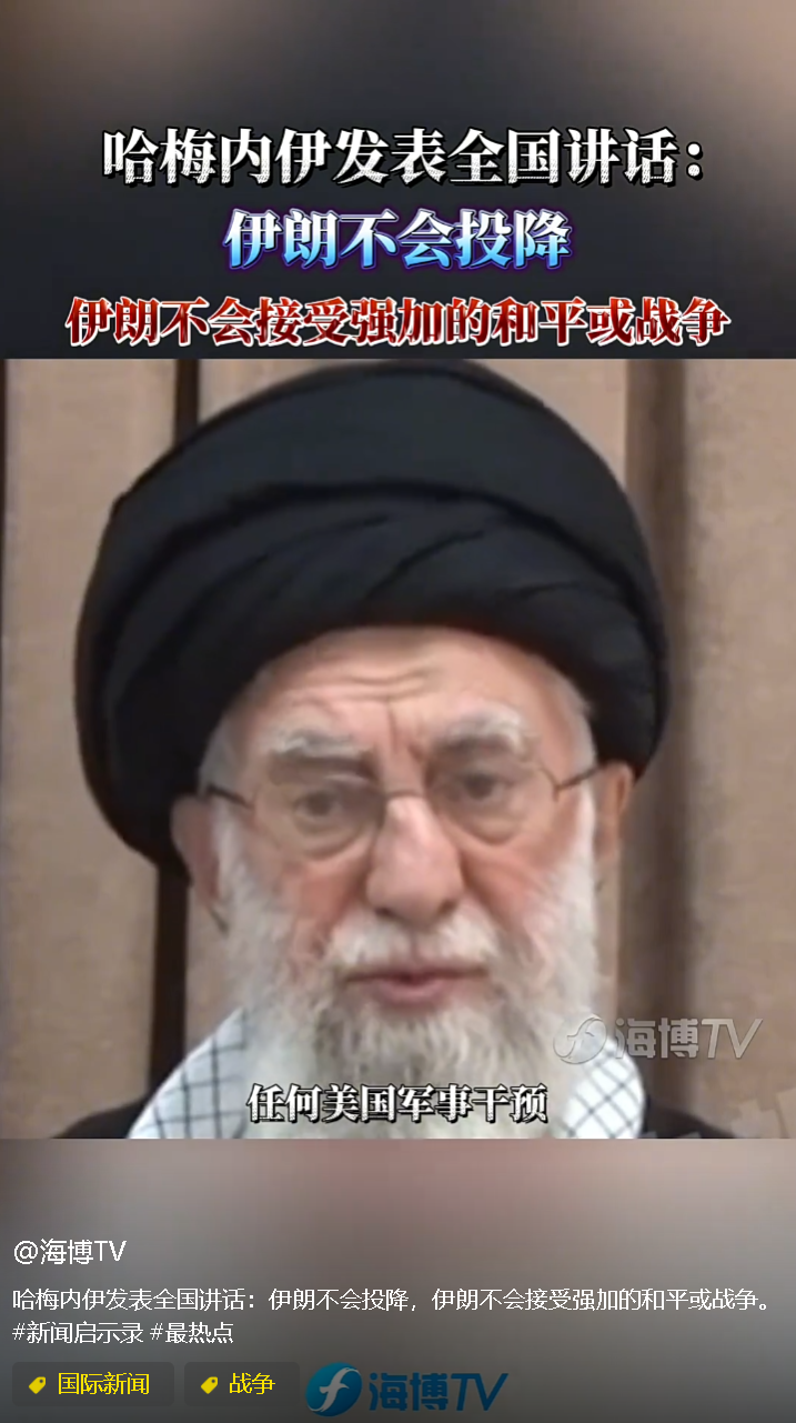 12 哈梅内伊发表全国讲话:伊朗不会投降,伊朗不会接受强加的和平或战争。
