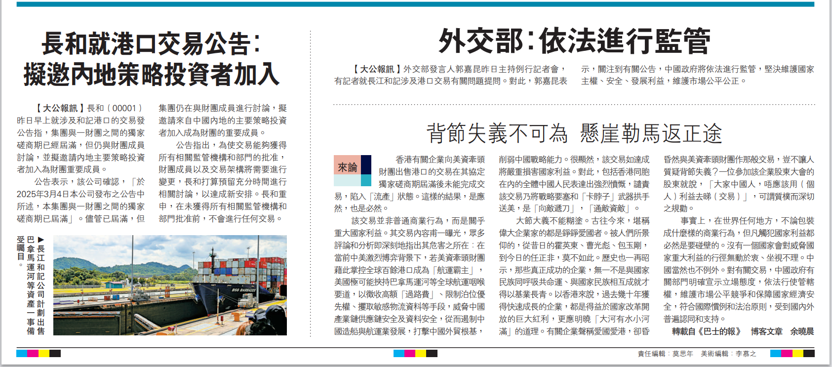 该交易并非普通商业行为,而是关乎重大国家利益。其交易内容甫一曝光,众多评论和分析即深刻地指出其危害之所在:在当前中美激烈博弈背景下,若美资牵头财团借此掌控全球百馀港口成为「航运霸主」,美国极可能挟持巴拿马运河等全球航运咽喉要道,以征收高额「过路费」、限制泊位优先权、攫取敏感物流资料等手段,威胁中国产业链供应链安全及数据安全,从而遏制中国造船与航运业发展,打击中国外贸根基,削弱中国战略能力。显然,该交易如达成将严重损害国家利益。对此,包括香港同胞在内的全体中国人民表达出强烈愤慨,谴责该交易乃将战略要塞和「卡脖子」武器拱手送美,是「向敌递刀」,「通敌资敌」。