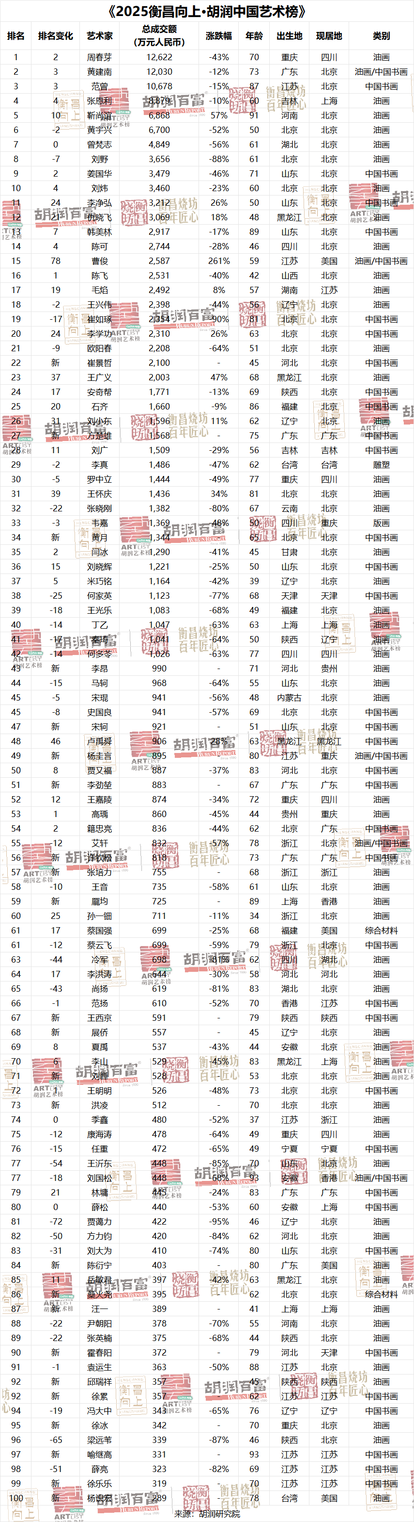 《2025衡昌向上·胡润中国艺术榜》根据2024年度公开拍卖市场作品总成交额为在世的中国艺术家排名。上拍艺术品均为通过公开场地拍卖,而不包括通过非公开场地出售(画廊、艺术家本人及私人交易),且包含拍卖公司的中介费用。
