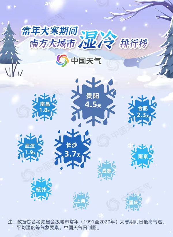 中国天气网统计了常年大寒期间南方大城市的湿冷日数,贵阳以4.5天排在榜首,除了冷暖空气交汇频繁外,云贵准静止锋也是贵阳拿下“湿冷王”的幕后推手。冷空气南下时,遭遇乌蒙山阻挡会形成准静止锋,而贵阳正处在冷空气堆积的一侧,冬季常常“天无三日晴”,潮湿阴冷。