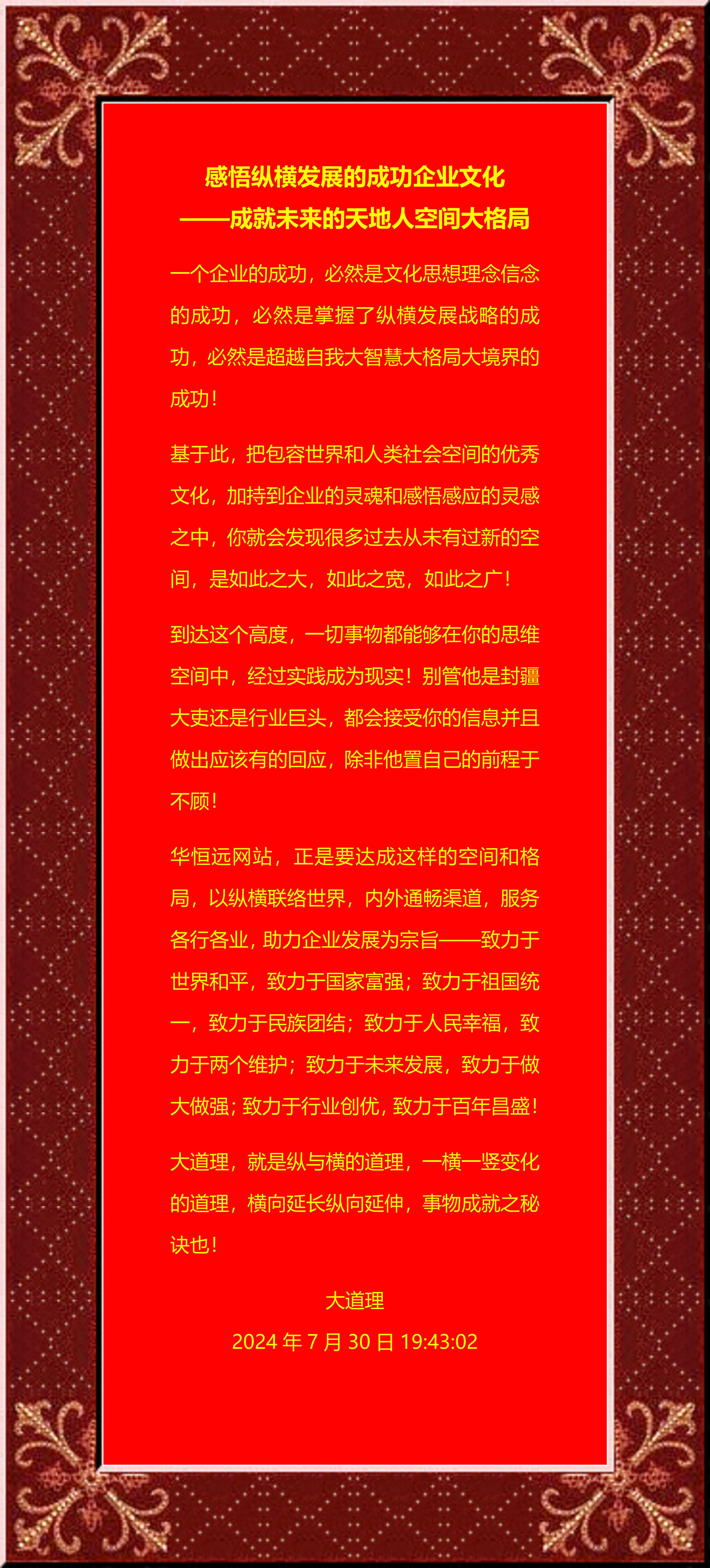 一个企业的成功,必然是文化思想理念信念的成功,必然是掌握了纵横发展战略的成功,必然是超越自我大智慧大格局大境界的成功!