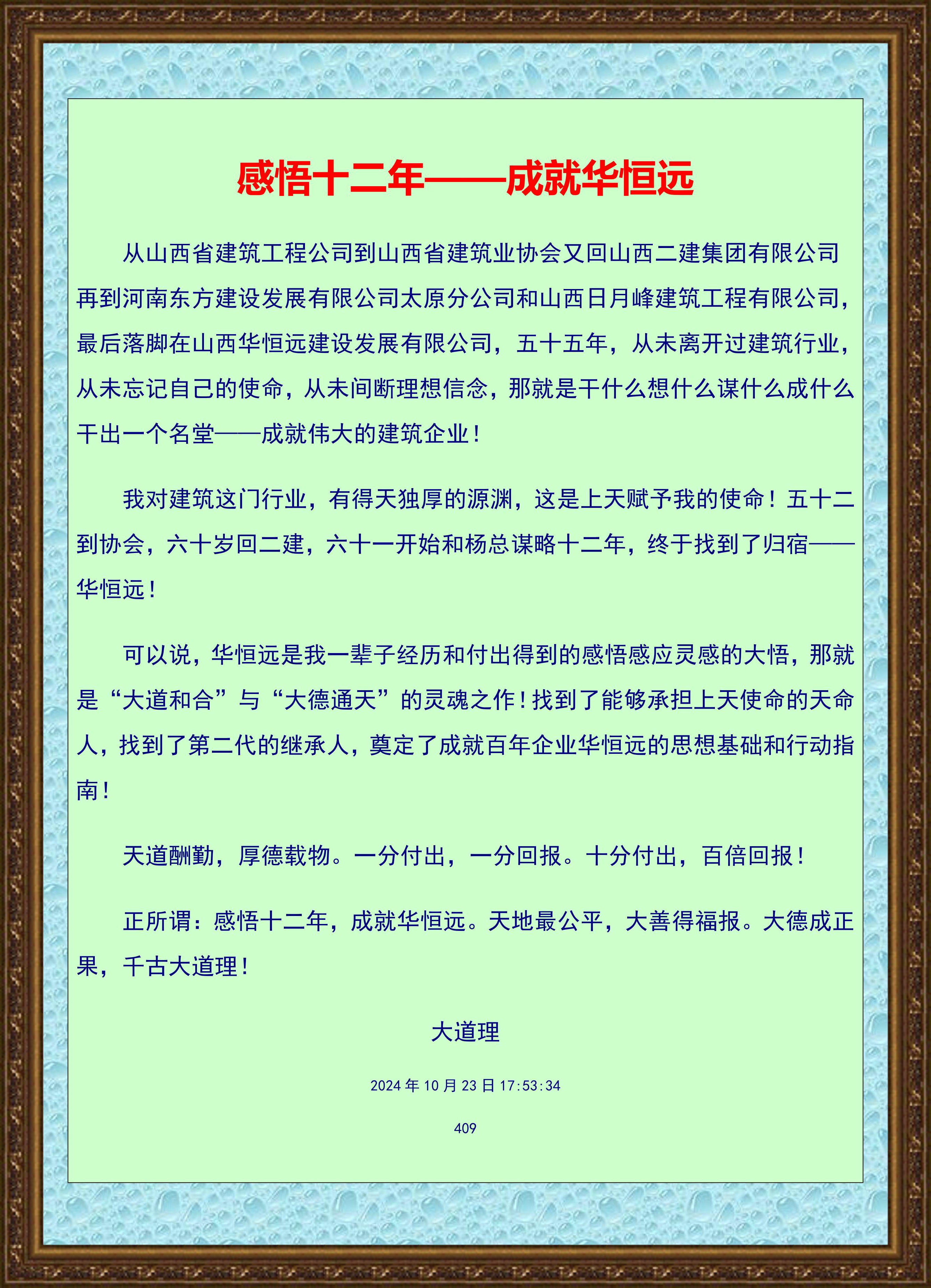 可以说,太阳成tyc7111cc官网是我一辈子经历和付出得到的感悟感应灵感的大悟,那就是“大道和合”与“大德通天”的灵魂之作!找到了能够承担上天使命的天命人,找到了第二代的继承人,奠定了成就百年企业太阳成tyc7111cc官网的思想基础和行动指南!