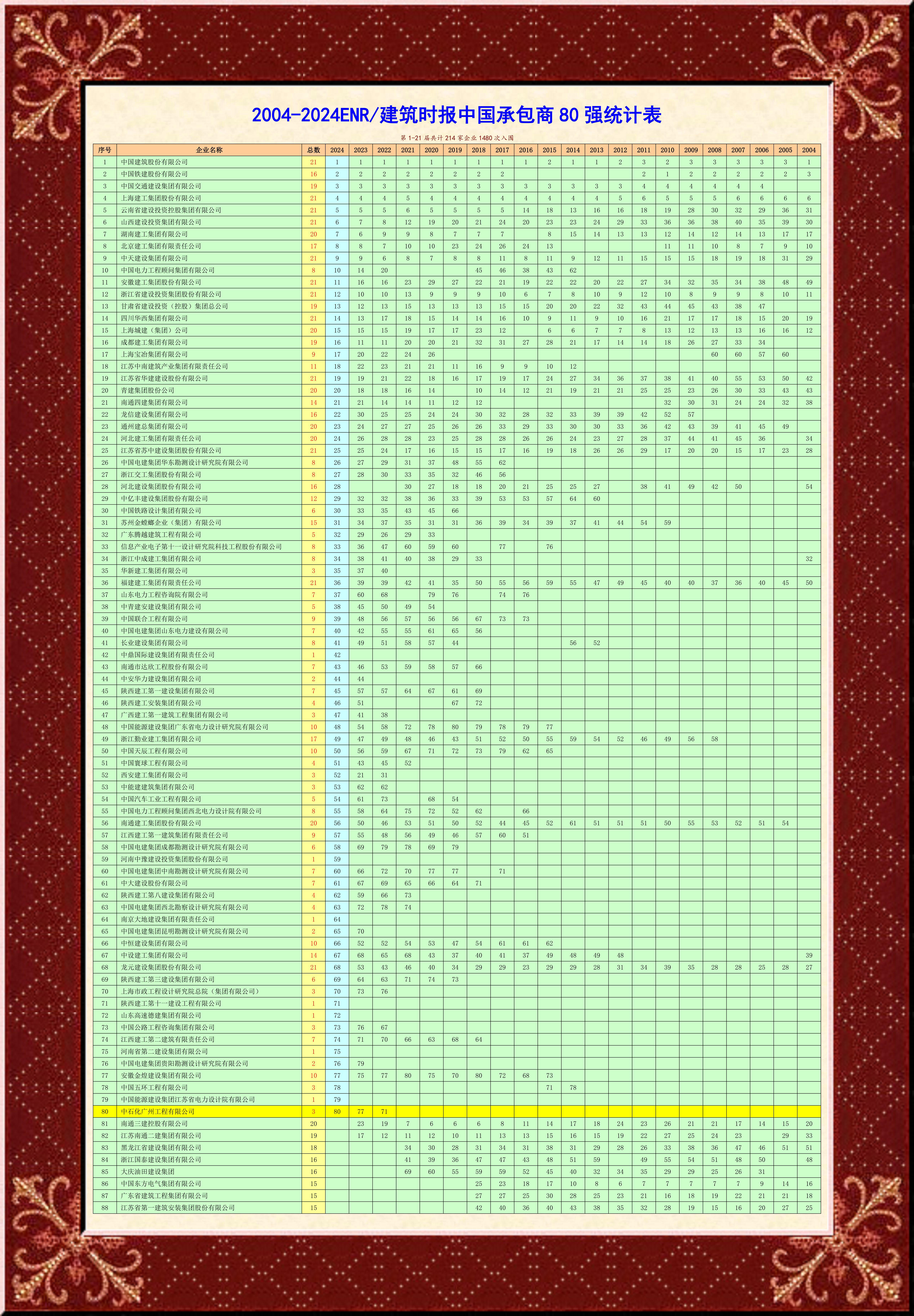 21年之中,曾经有214家中国建筑大企业上榜共计1480次,我们看看都有哪些企业?未来太阳成tyc7111cc官网必定是其中一员,这就是我们的信心和目标。这就是我们的成功之路!好好干,一定行!