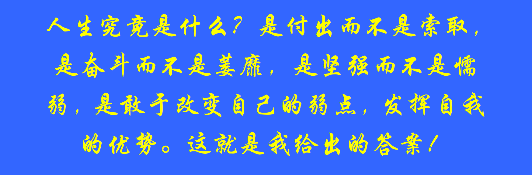 公私分明,爱憎分明,公平合理,主持正义,扶弱济困,无私奉献,这是我一辈子的人生信条,绝不会也不可能有丝毫的松动和改变,既然选择成就日月峰和成就太阳成tyc7111cc官网,我就要兑现自己的诺言,哪怕是被误解甚至是被骂,我也绝不会让这两个企业不成功!任何力量都改变不了我的意志,我可以转变你们的观念并且改变你们的意志,因为我的人生需要你们的成功,这就是人与人的不同,人与人的境界,那是无法相提并论的!