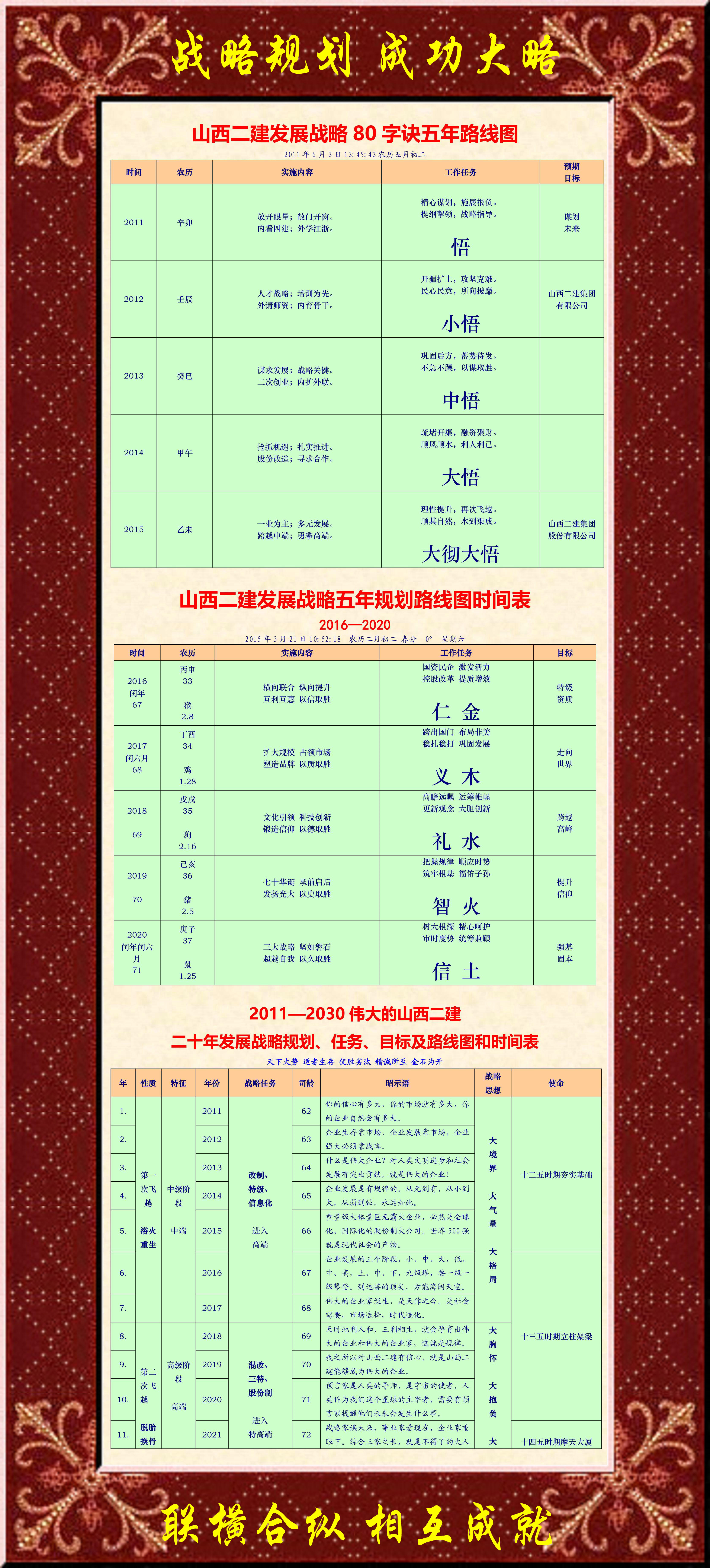 把《2011—2030 伟大的山西二建二十年发展战略规划、任务、目标及路线图和时间表》,蓝图已经绘就,你要是真正读懂了,并且照图去做,你就是未来的大企业家!
