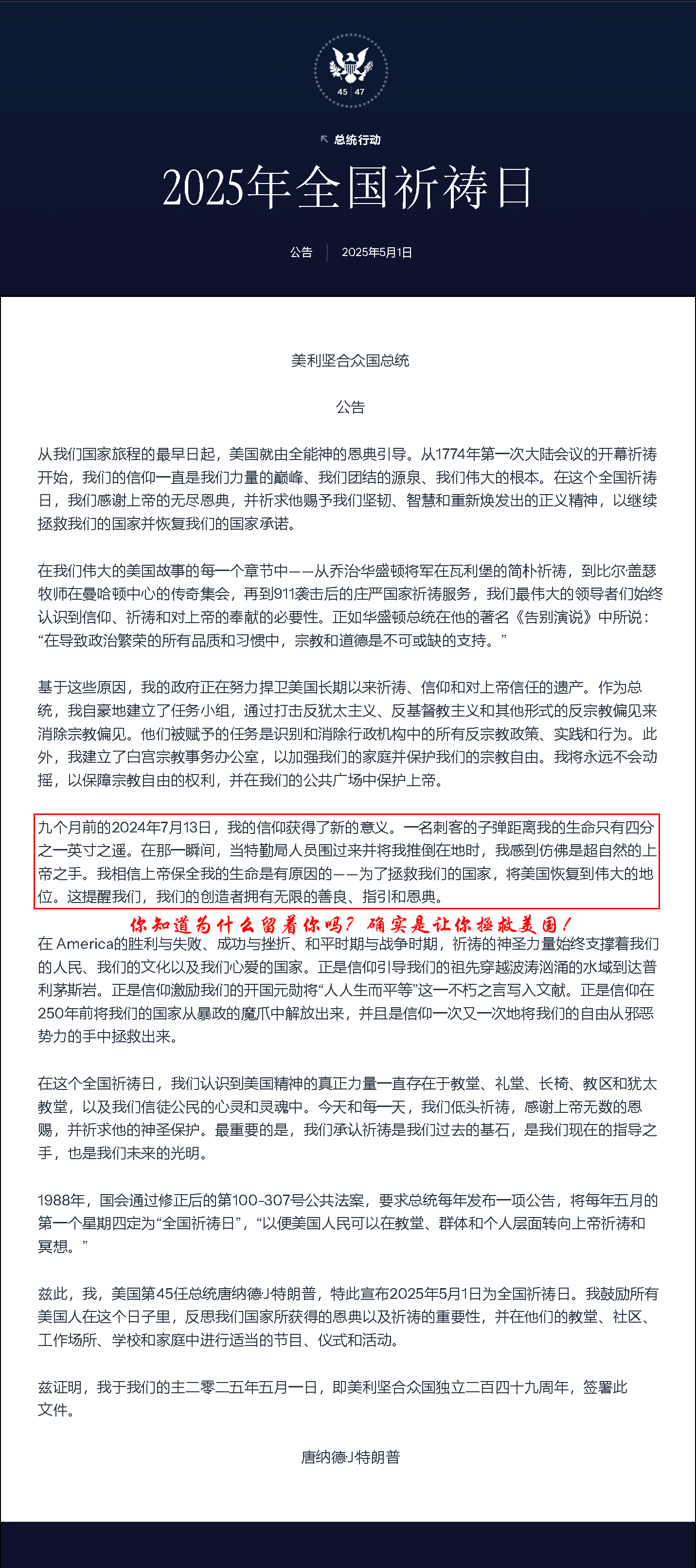 特朗普五月一日公告,字里行间为自己歌功颂德,却忘记了上天留他一命的使命和任务是什么?!