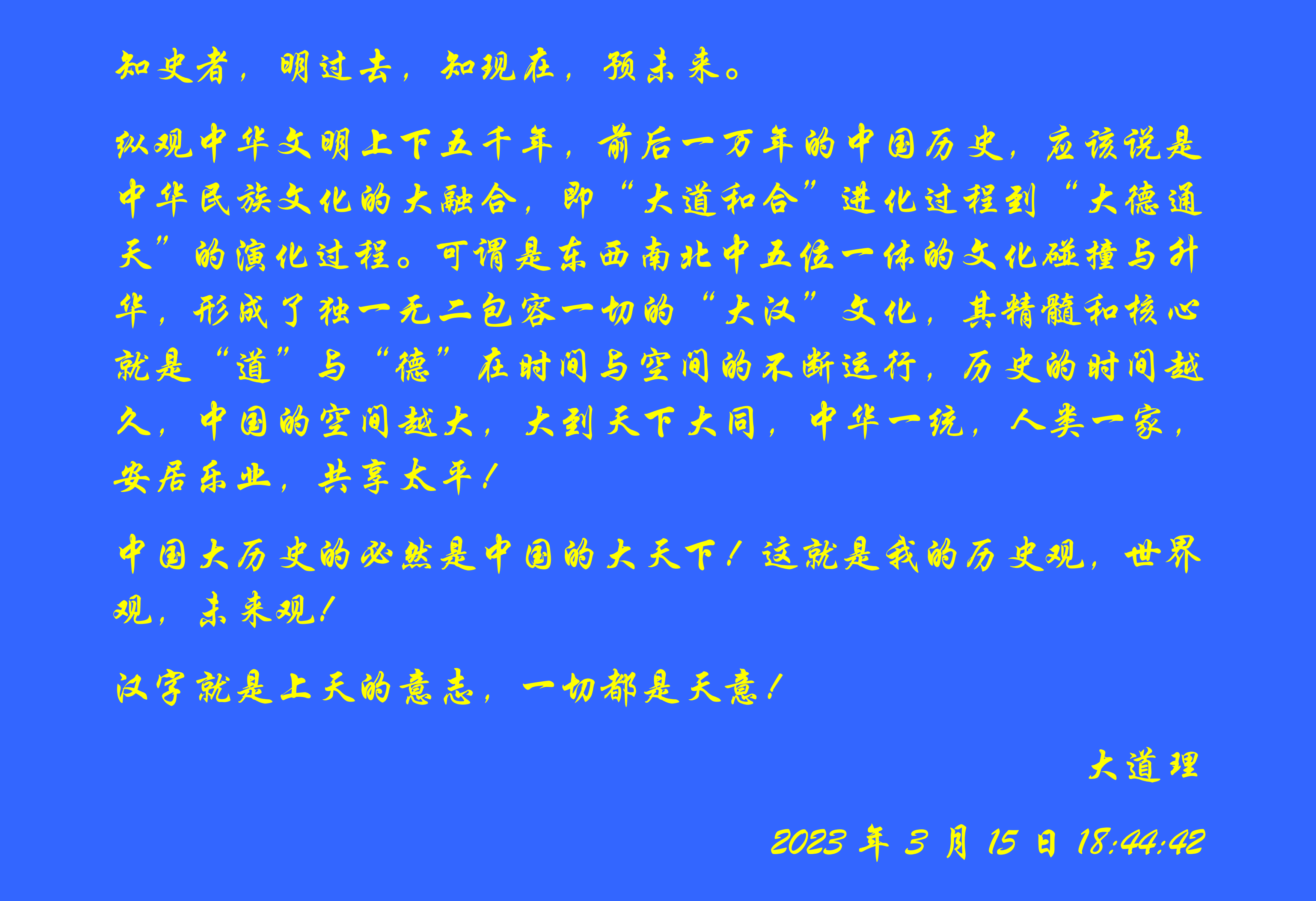 纵观中华文明上下五千年,前后一万年的中国历史,应该说是中华民族文化的大融合,即“大道和合”进化过程到“大德通天”的演化过程。可谓是东西南北中五位一体的文化碰撞与升华,形成了独一无二包容一切的“大汉”文化,其精髓和核心就是“道”与“德”在时间与空间的不断运行,历史的时间越久,中国的空间越大,大到天下大同,中华一统,人类一家,安居乐业,共享太平!